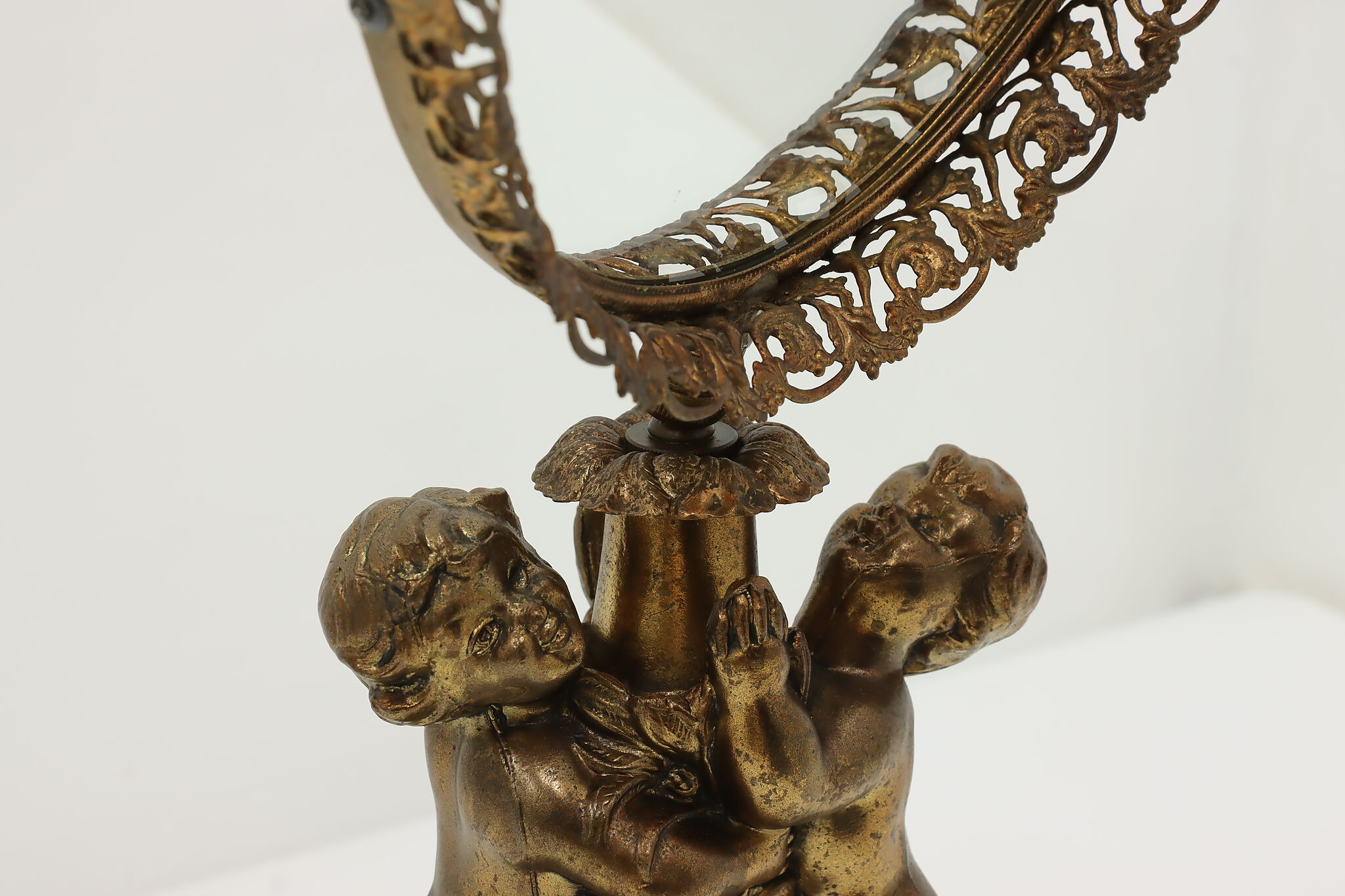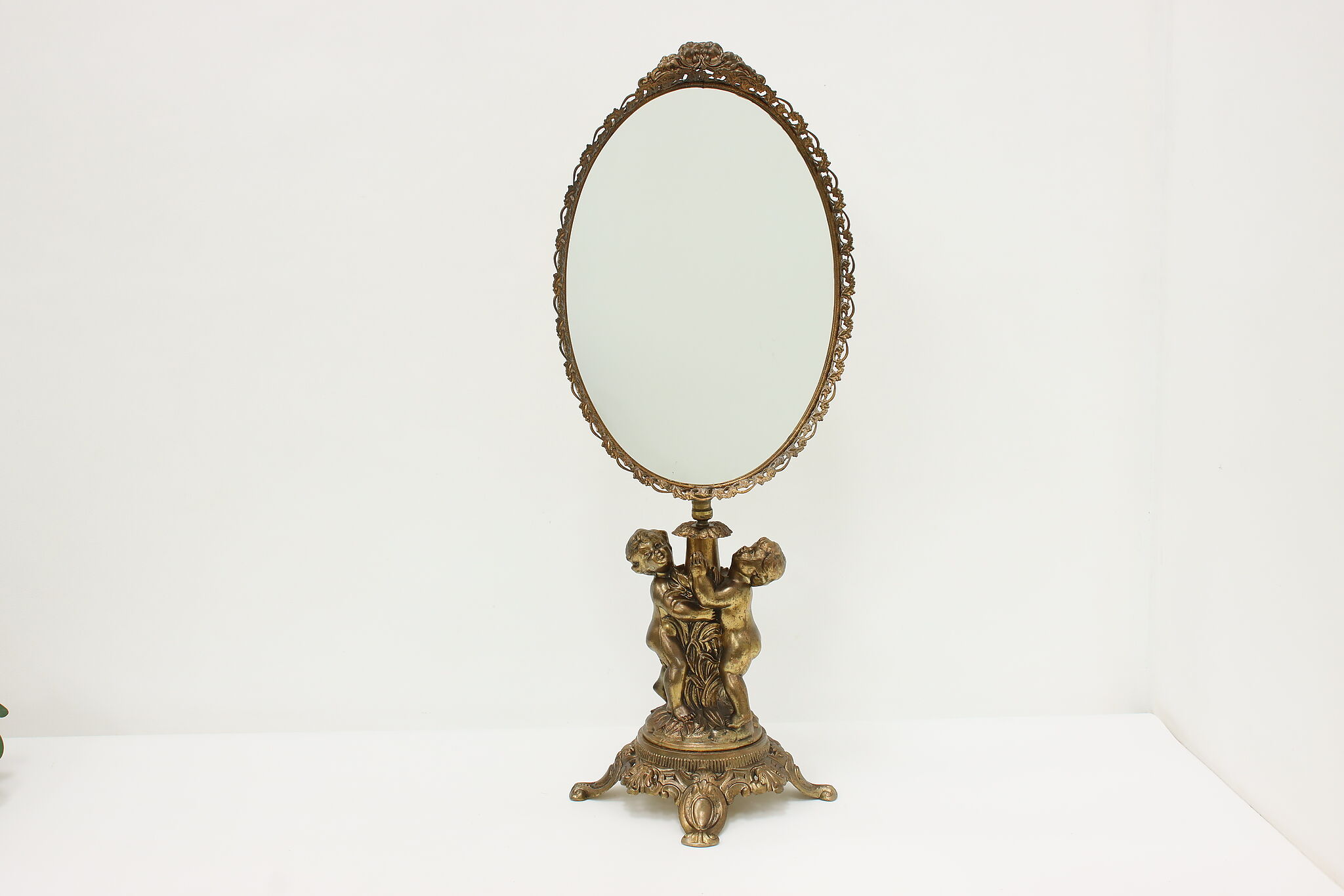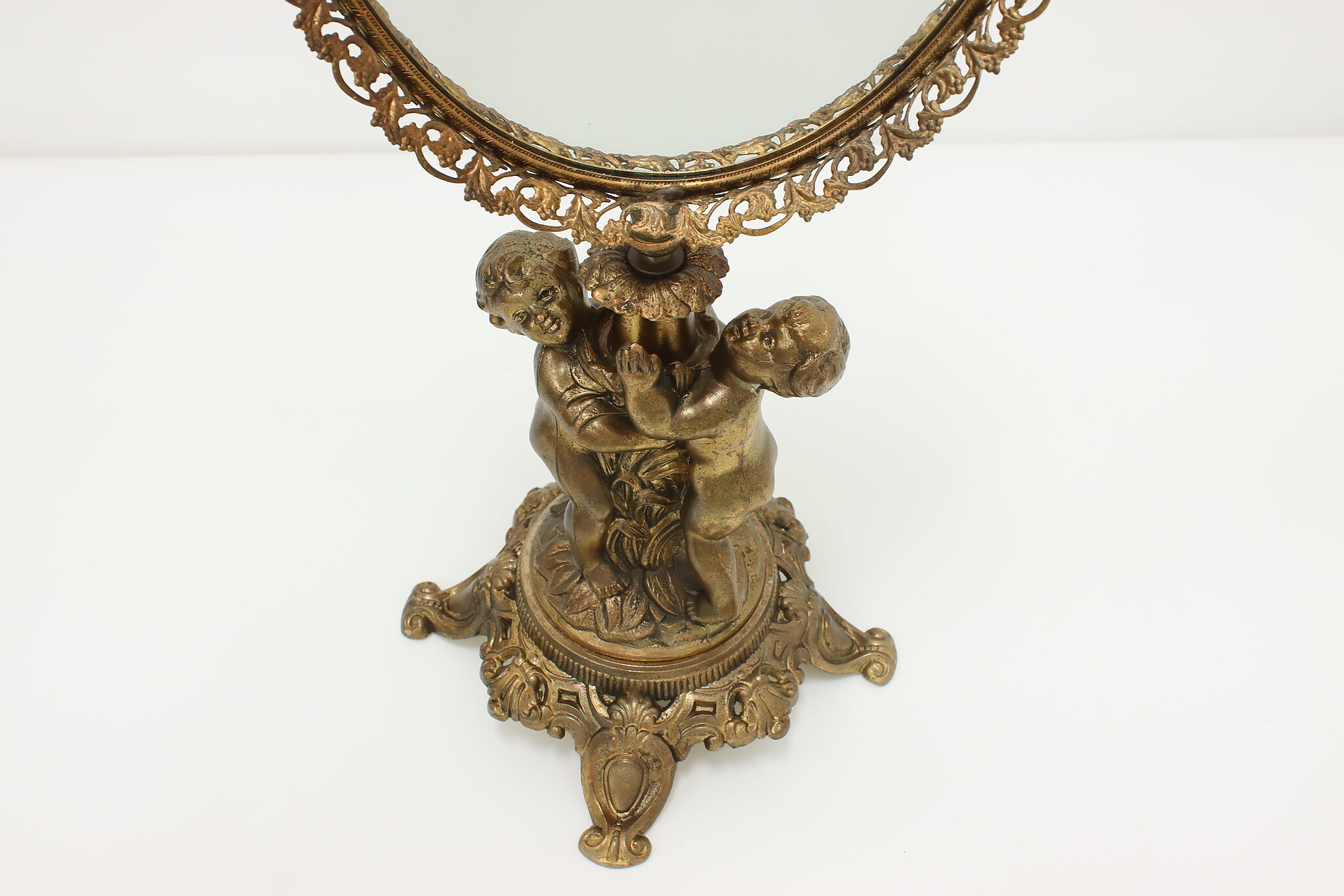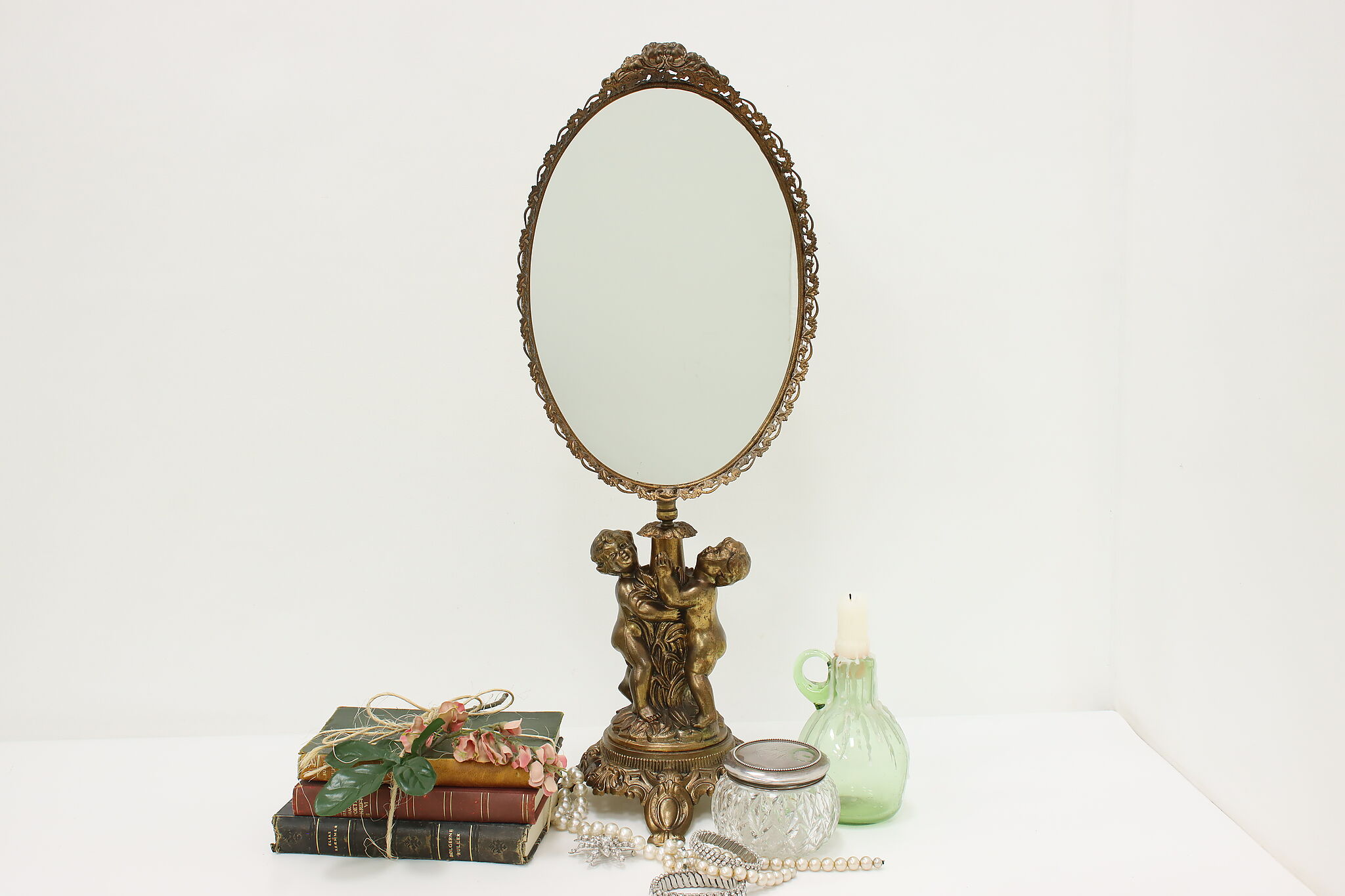 This darling Victorian style tabletop mirror has charming cherub sculptures and the mirror is adjustable to view yourself perfectly!