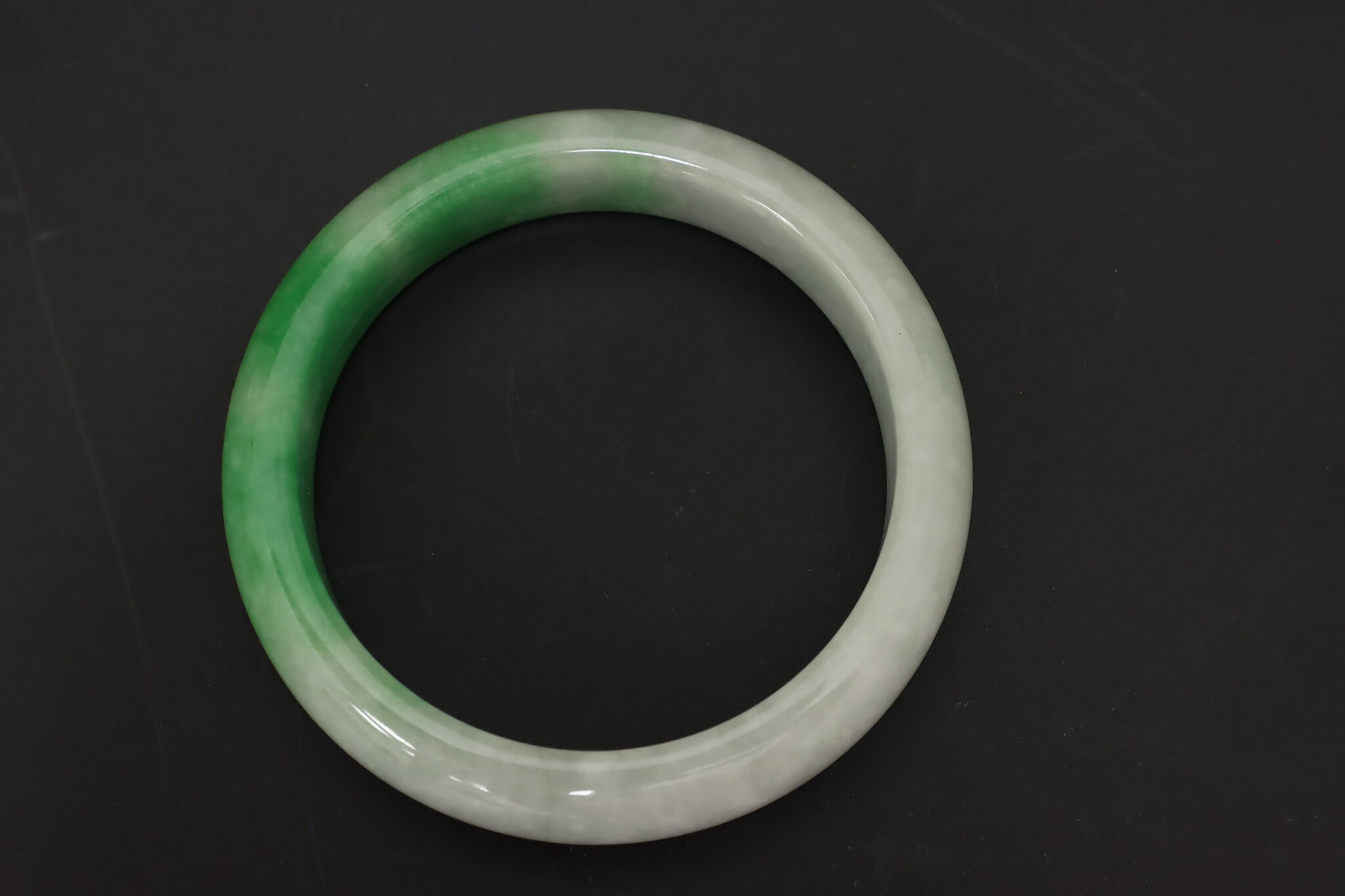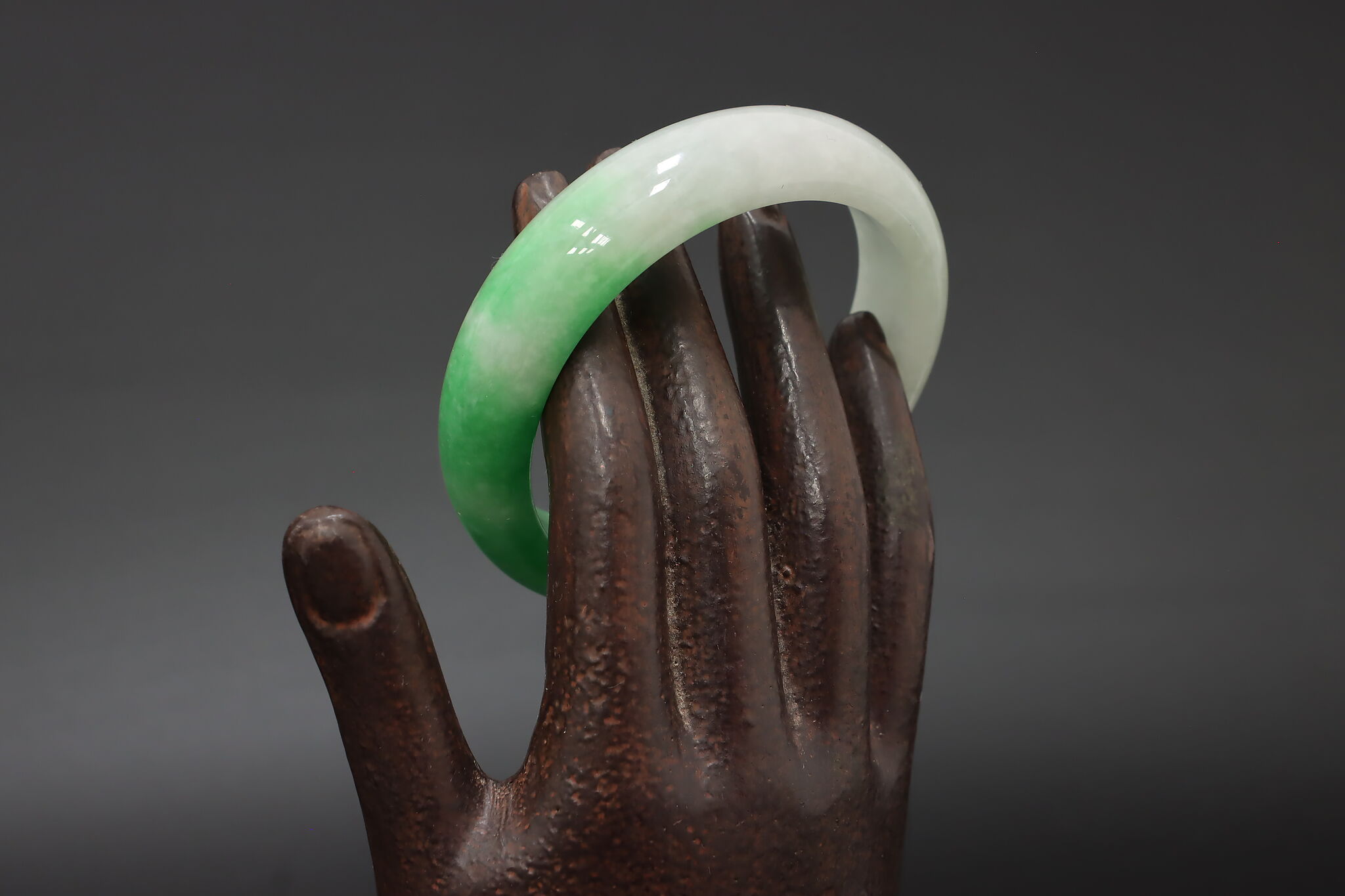 Jade has been cherished for centuries for its association with harmony, longevity, and protection. Two-tone jade bangles like this are especially desirable, as the natural color transitions highlight the stone’s organic formation and individuality.