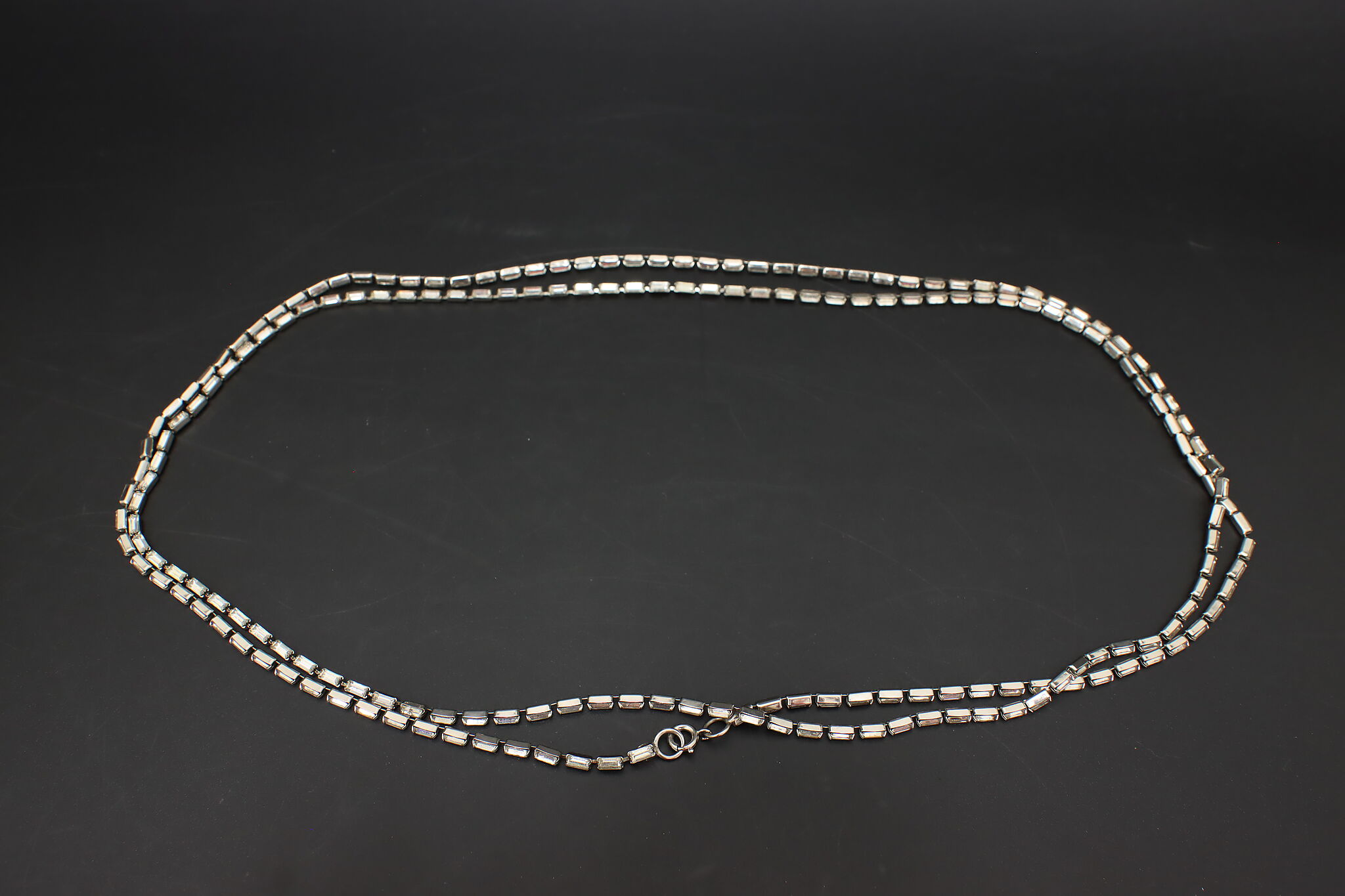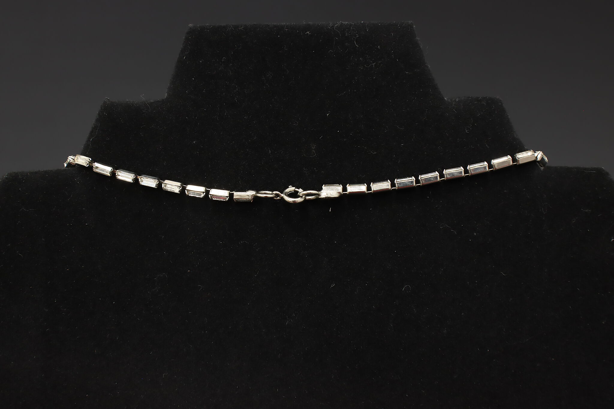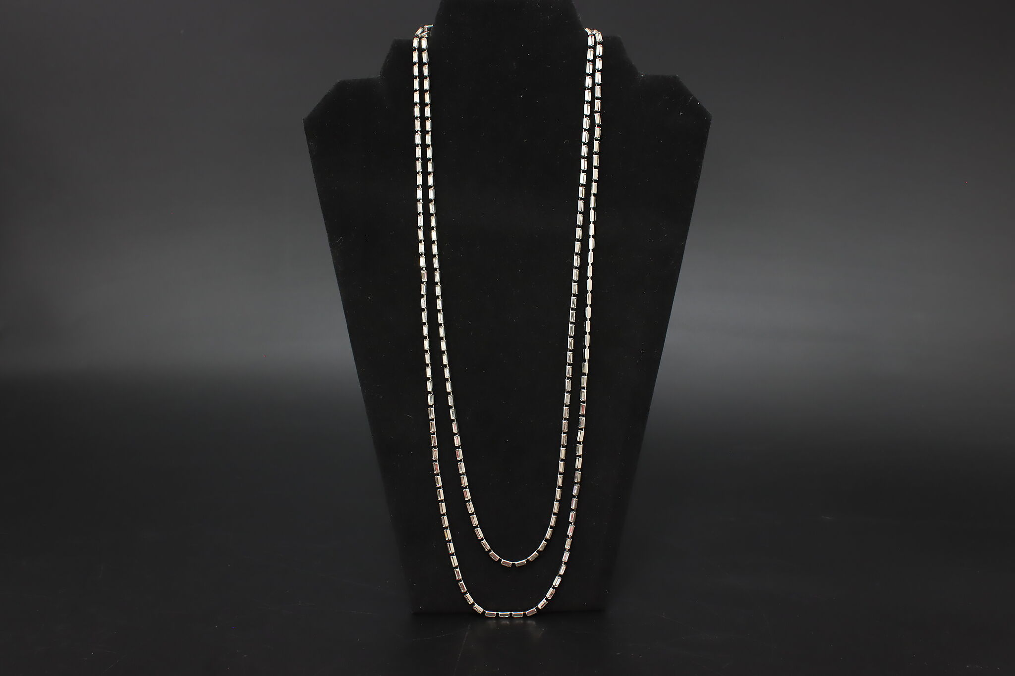Striking Kenneth Lane opera-length necklace featuring a continuous row of emerald-cut or baguette-style clear crystals set in a sleek silver-tone mounting. Wear long, doubled, or layered for a bold vintage look.