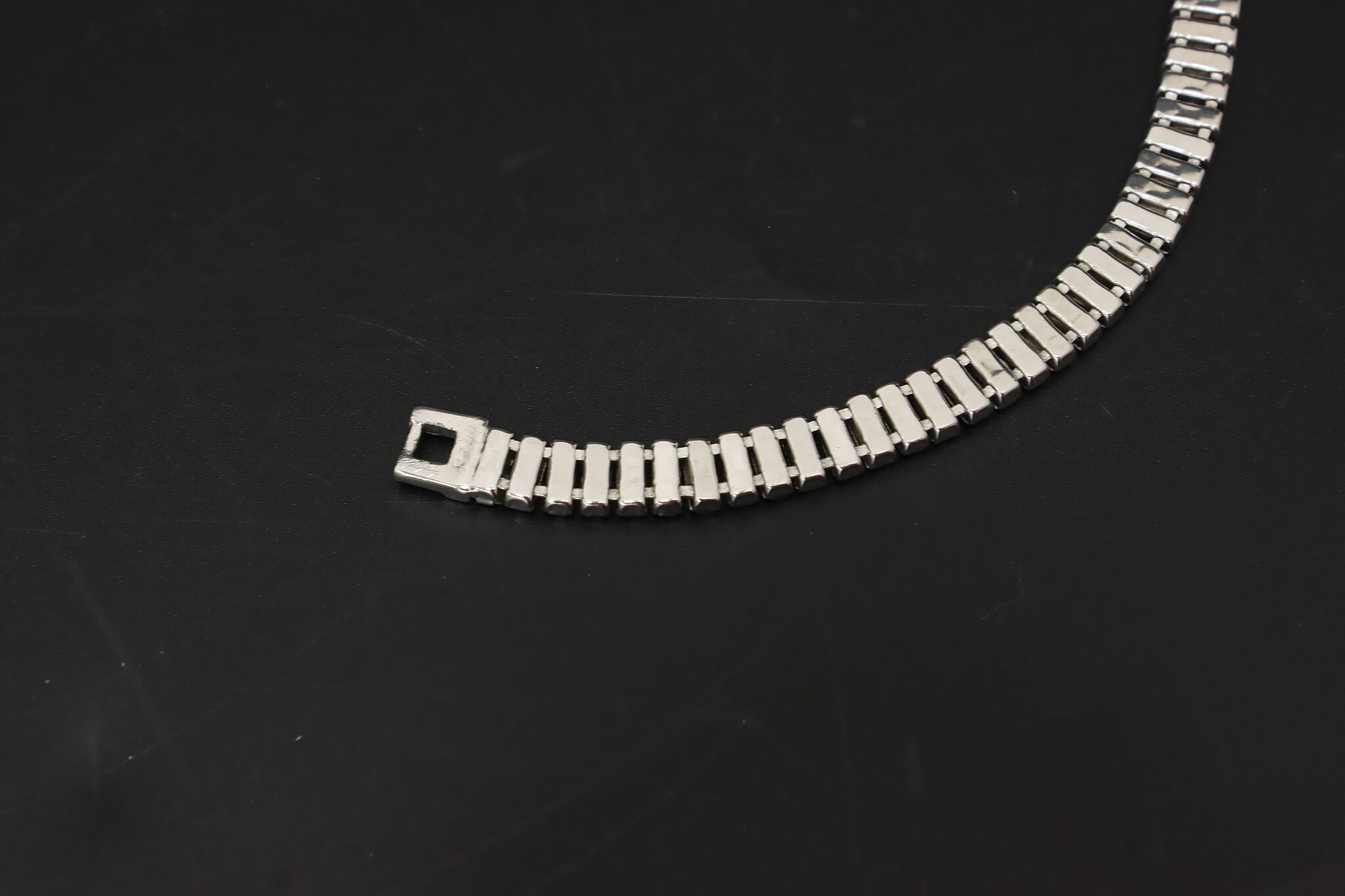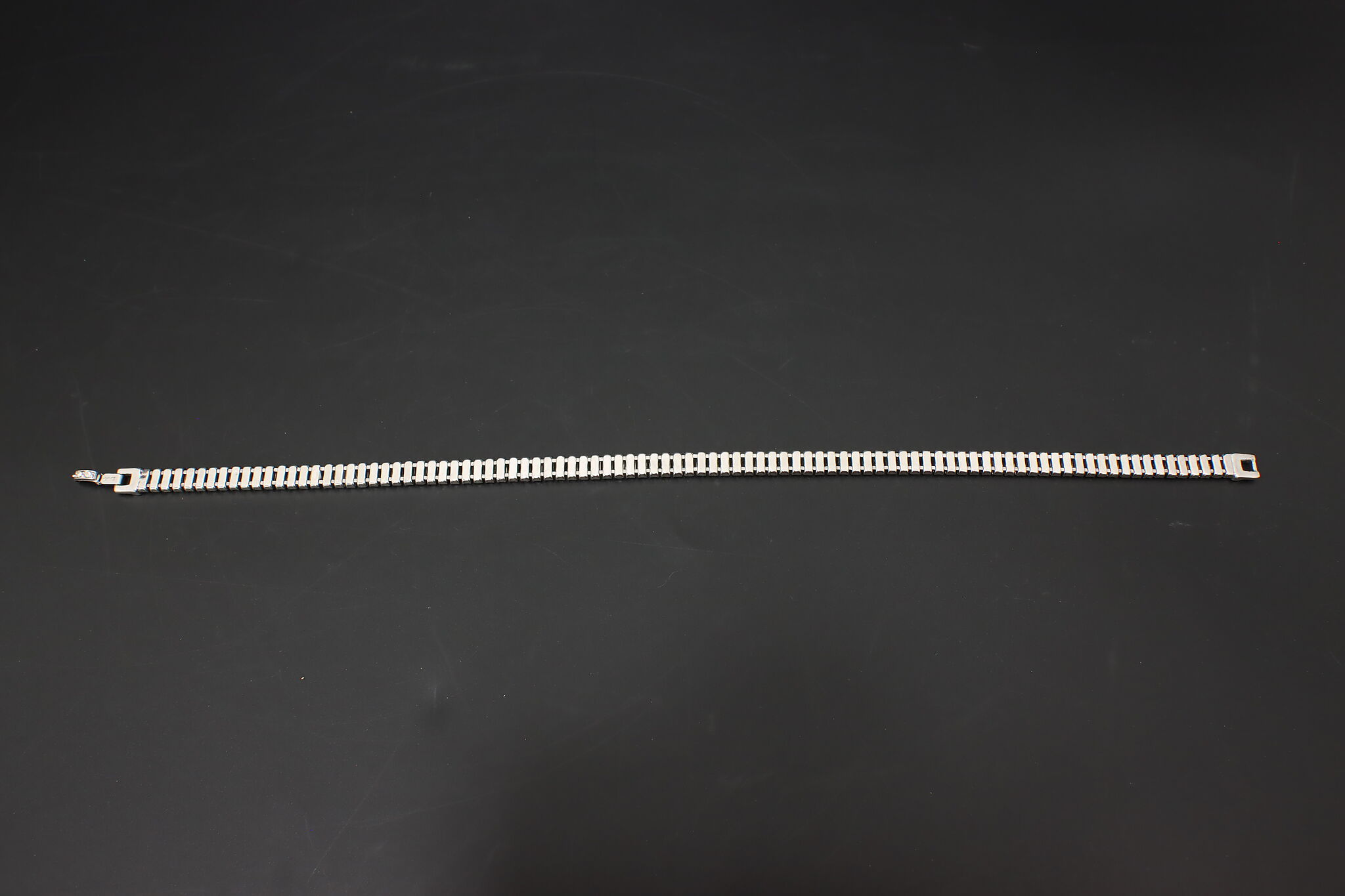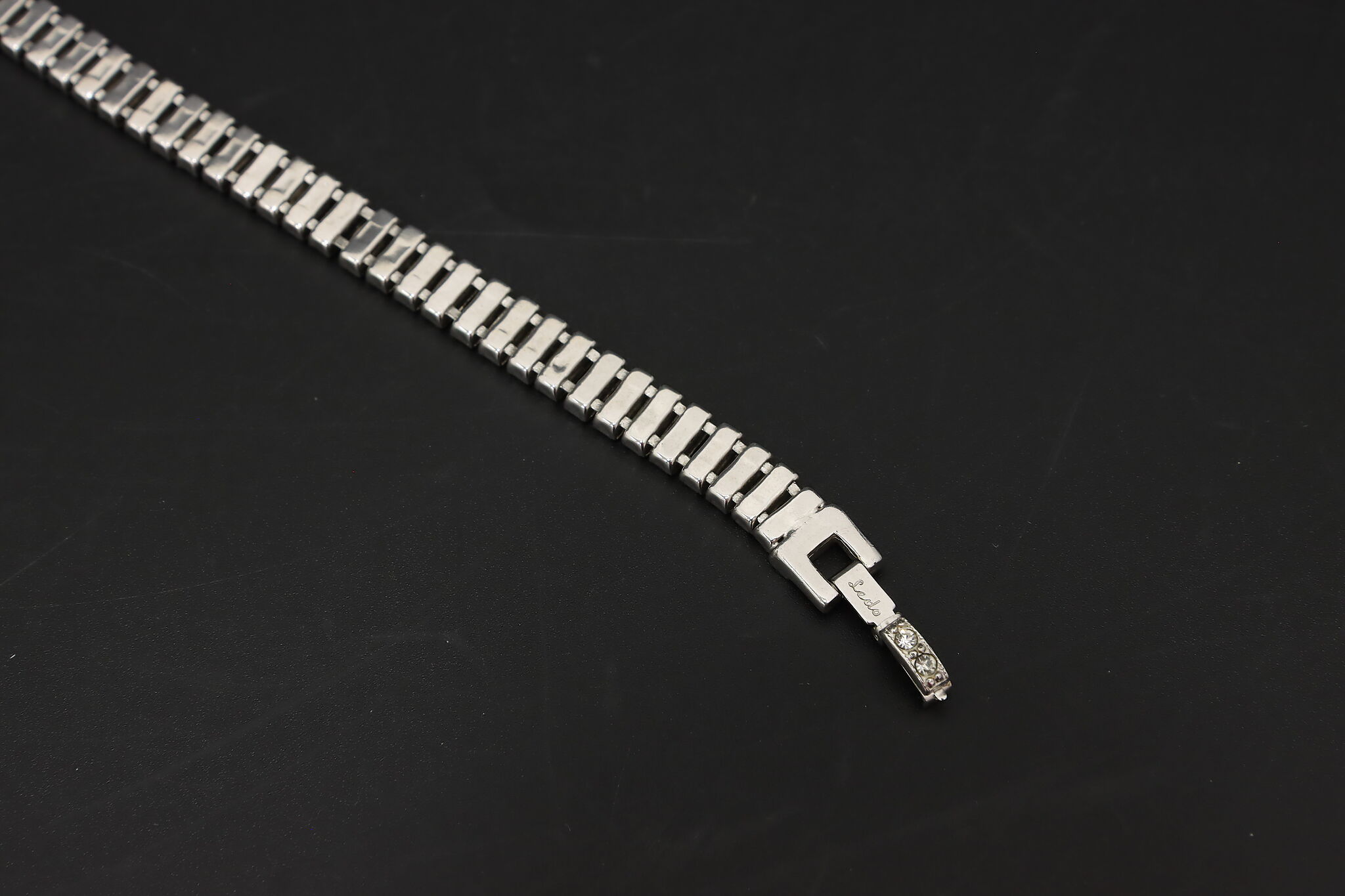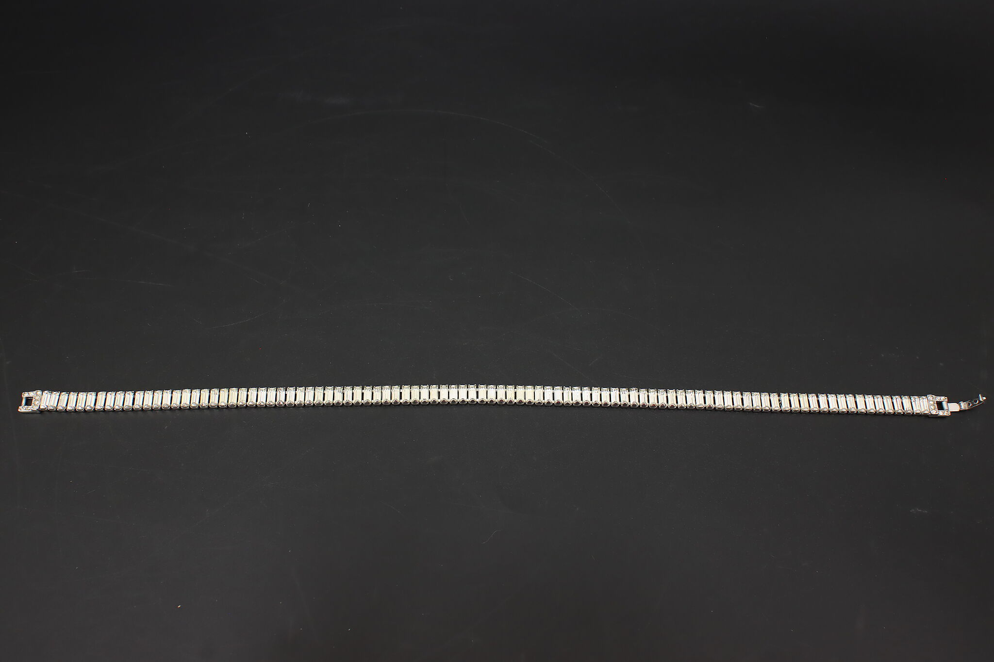 Striking Kenneth Lane opera-length necklace featuring a continuous row of emerald-cut or baguette-style clear crystals set in a sleek silver-tone mounting. Wear long, doubled, or layered for a bold vintage look.