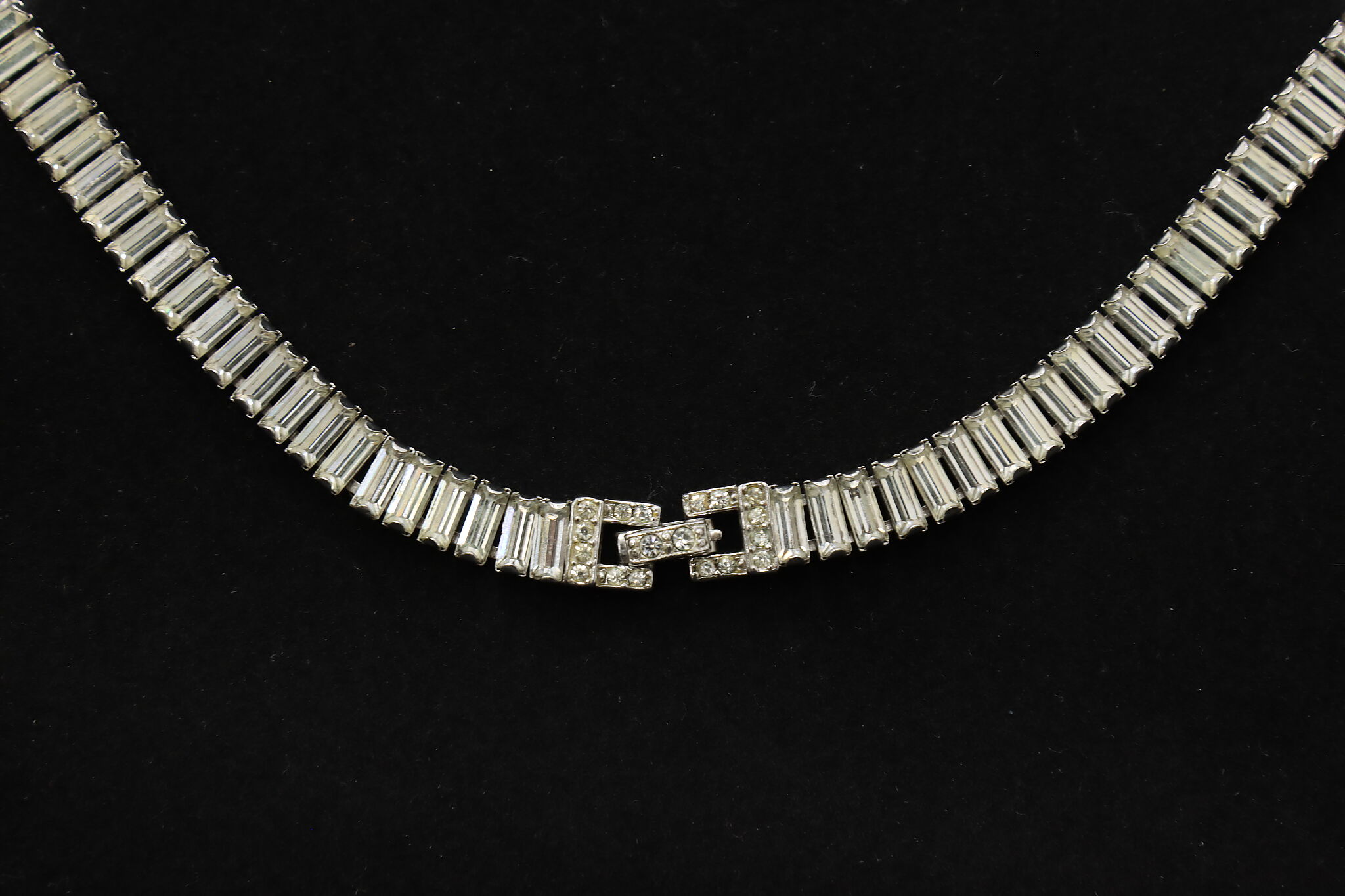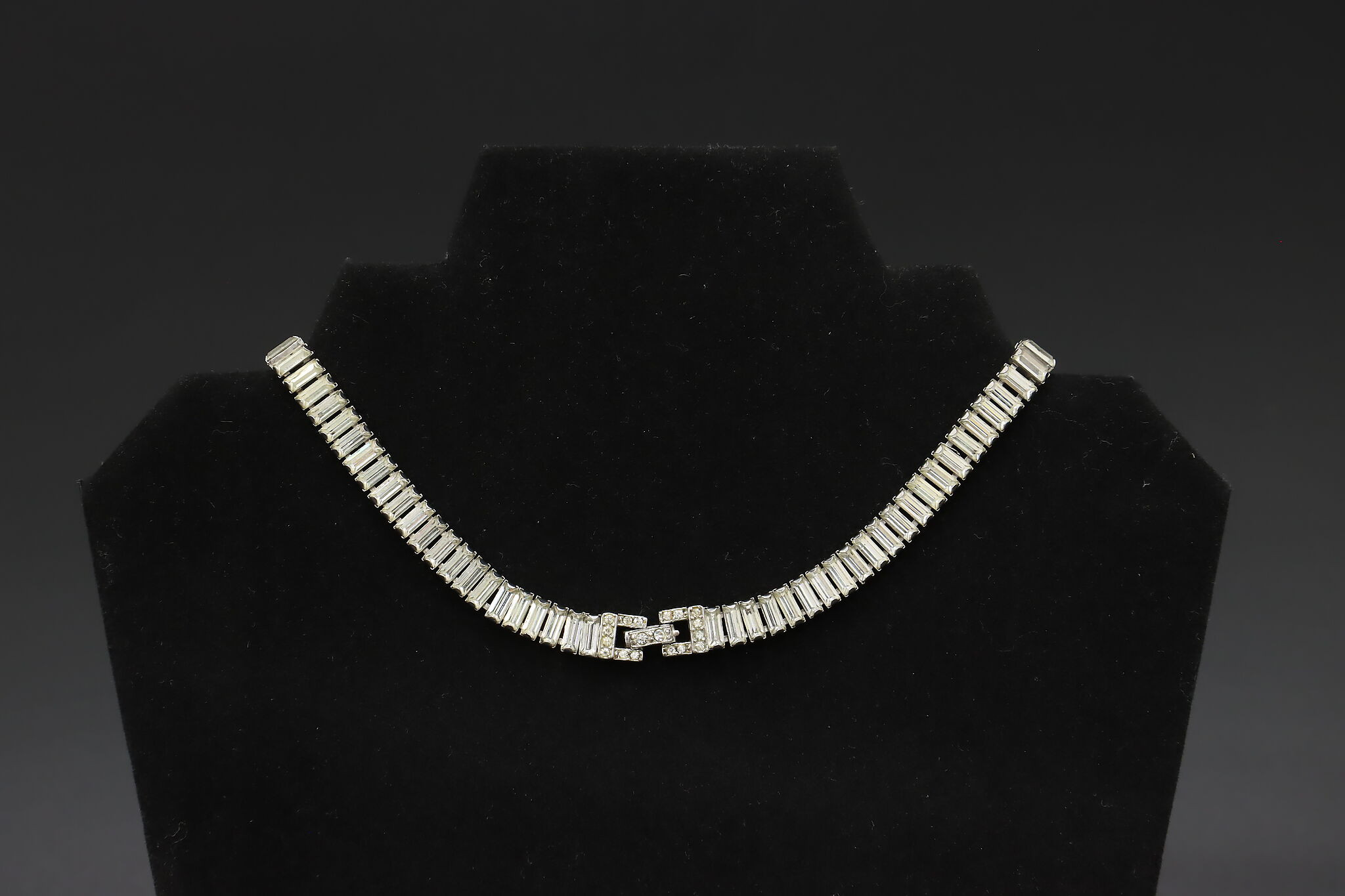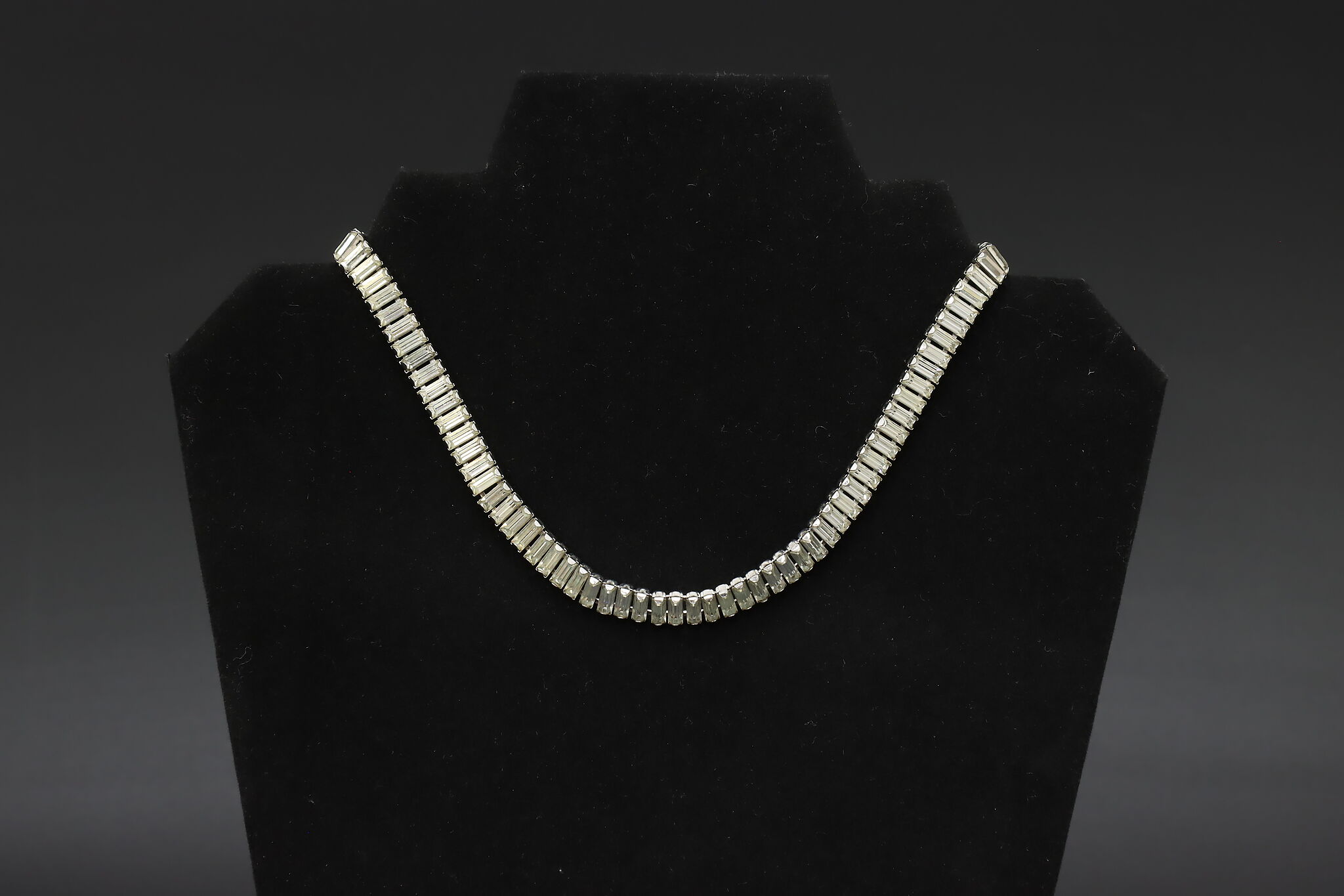 Elegant Ledo necklace featuring a continuous row of baguette-cut crystals set in a sleek silver-tone mounting. The clean linear design gives this piece a refined, structured look with strong light reflection and a classic mid-century feel.