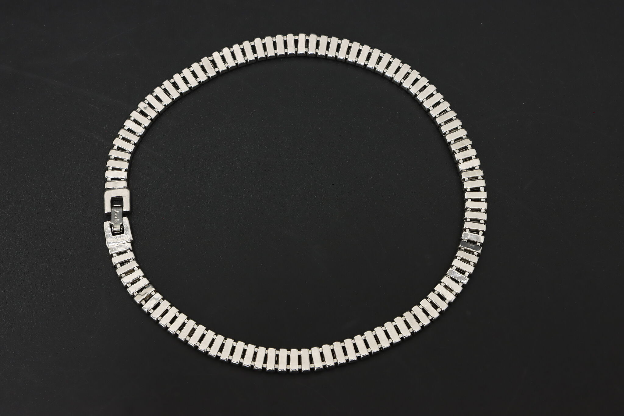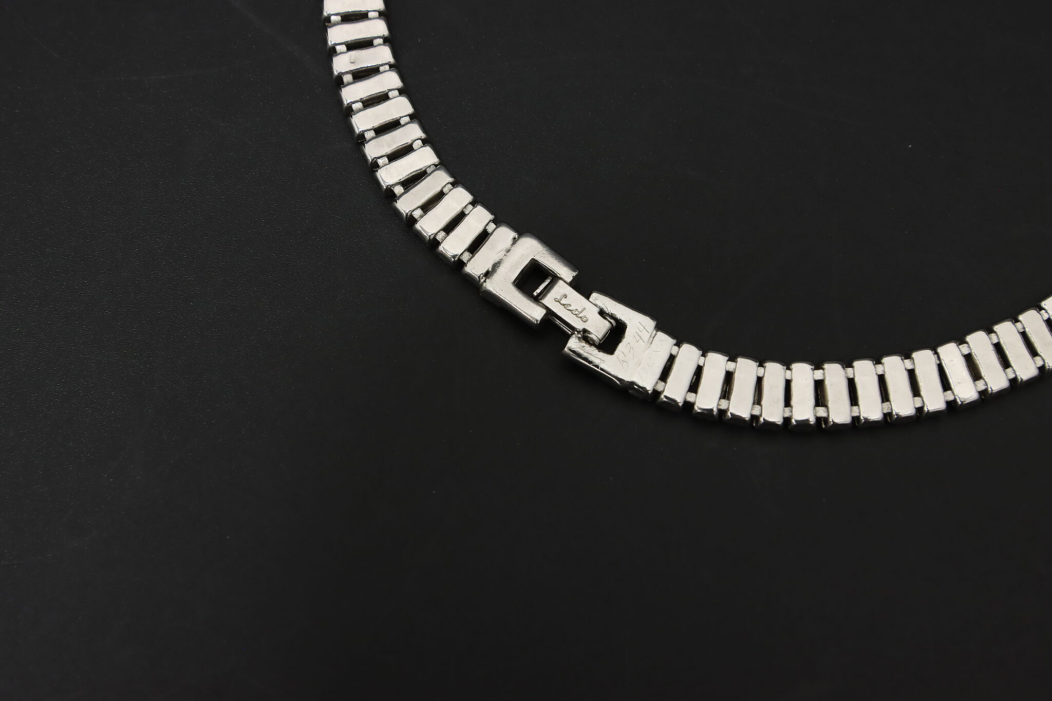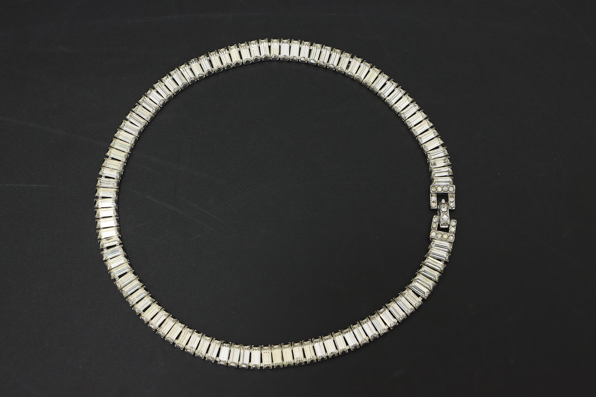 Elegant Ledo necklace featuring a continuous row of baguette-cut crystals set in a sleek silver-tone mounting. The clean linear design gives this piece a refined, structured look with strong light reflection and a classic mid-century feel.