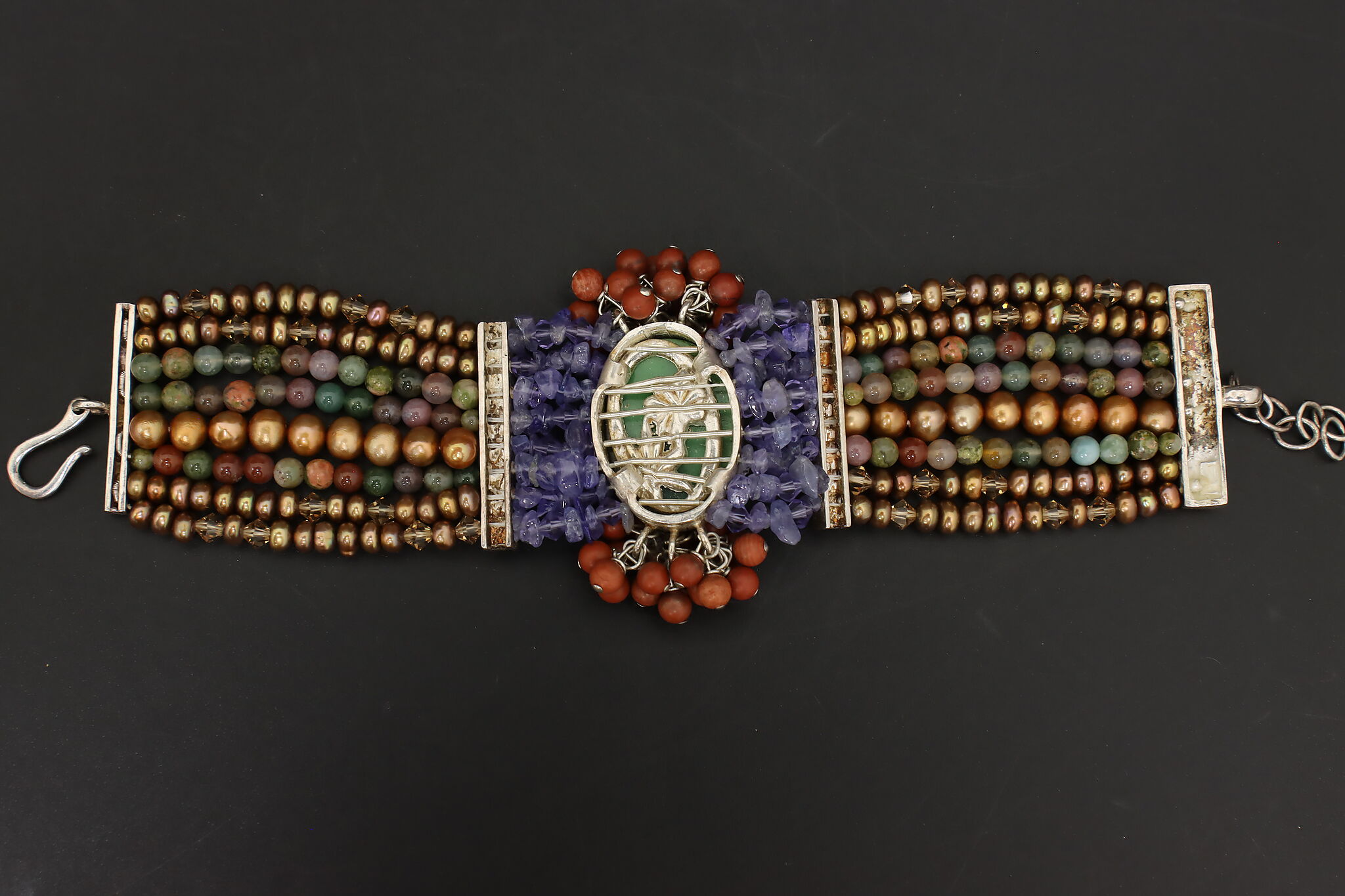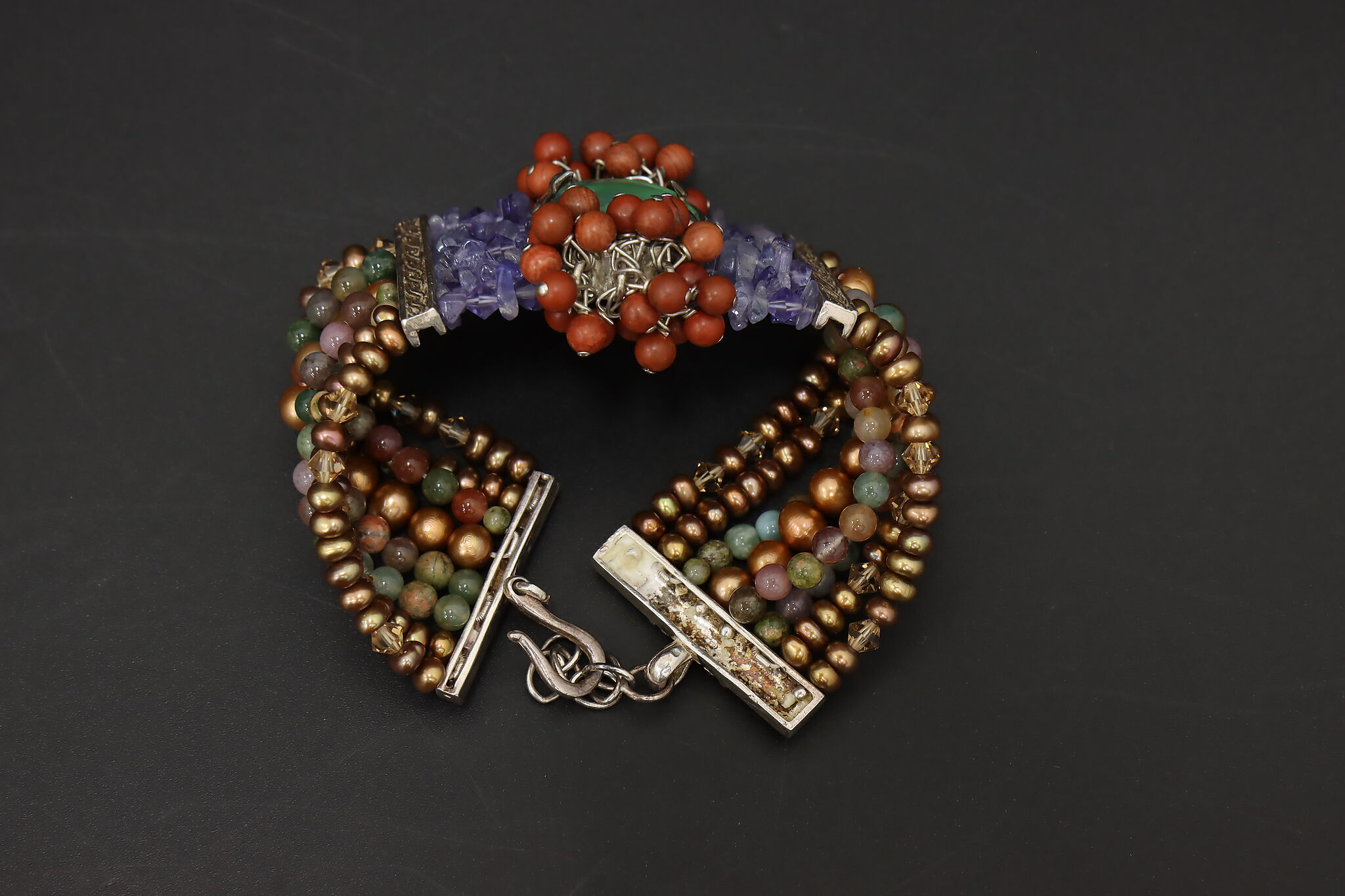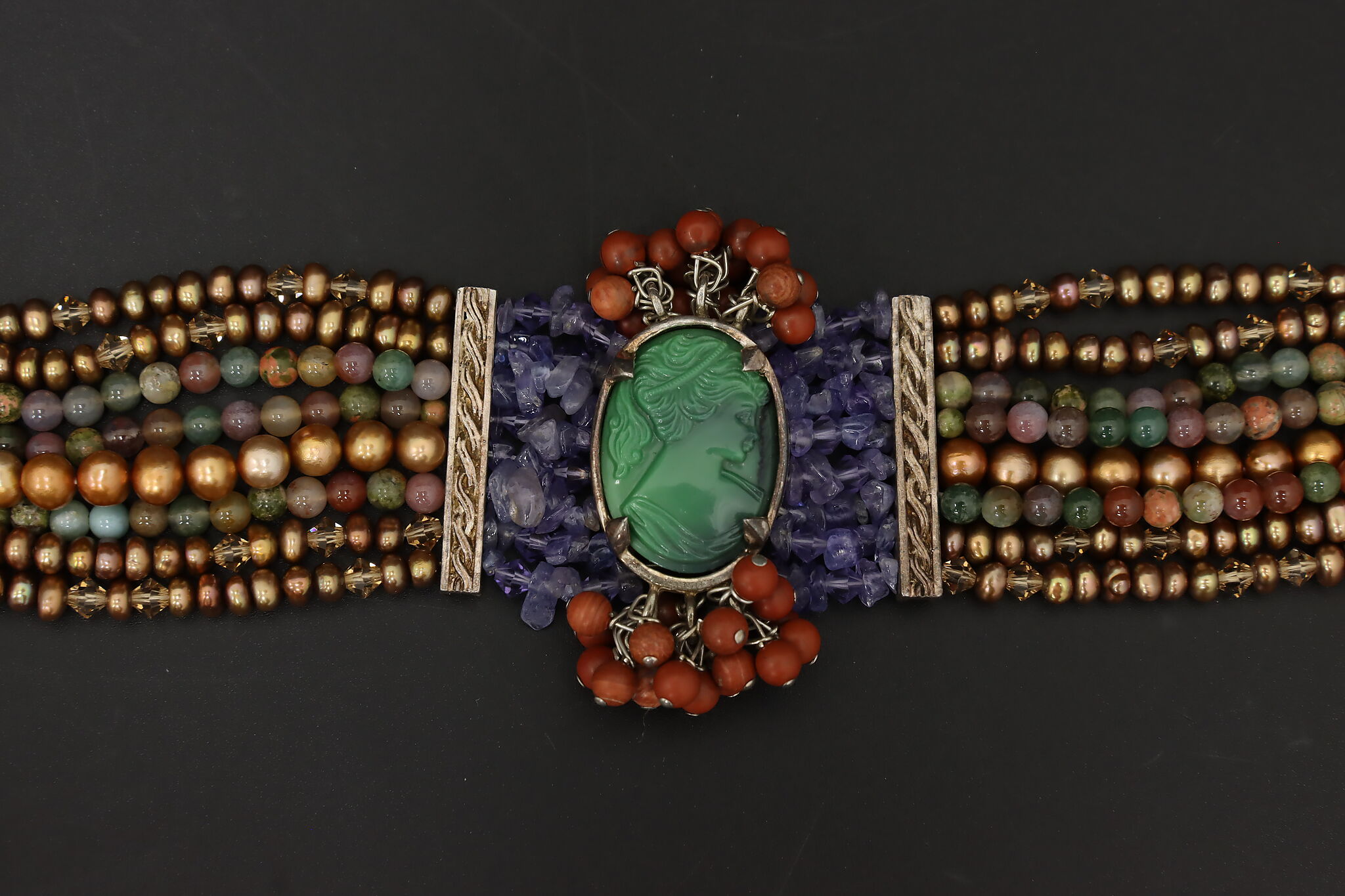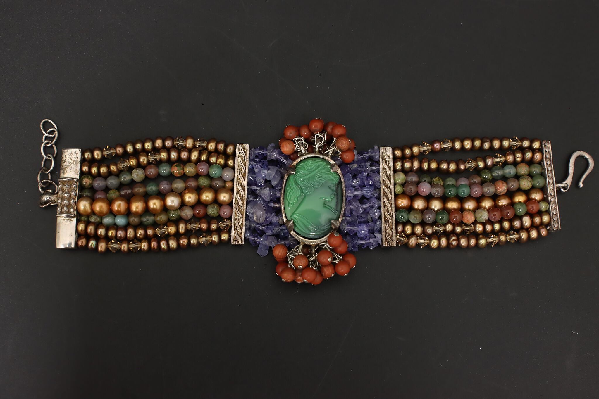 Striking vintage bracelet featuring multiple strands of semi-precious stone beads in warm earth tones, accented with a carved green cameo centerpiece. The bracelet incorporates textured metal spacers, clusters of coral-tone beads, and faceted accent beads for layered dimension and bold visual contrast.