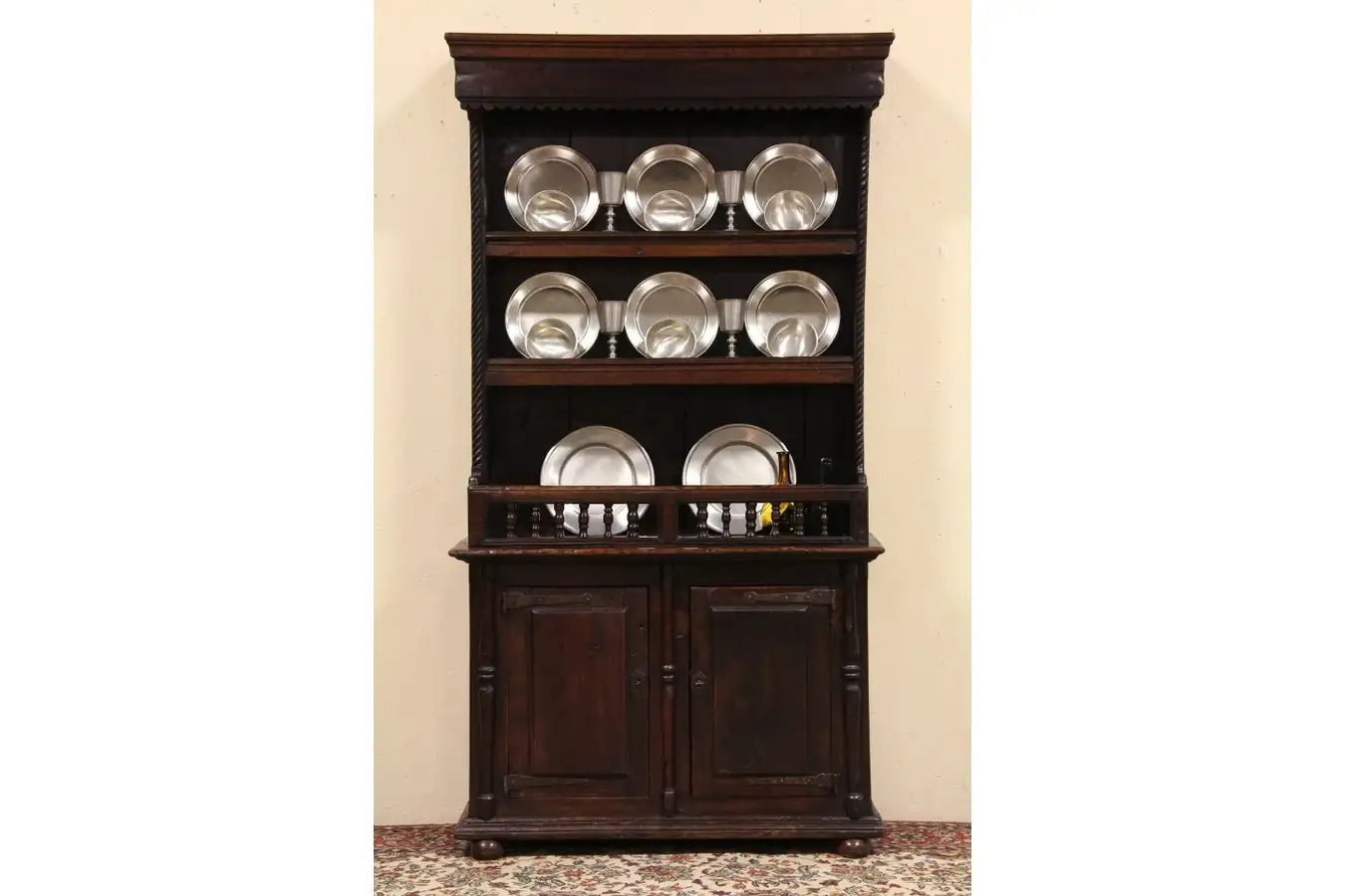 Hand hewn of solid walnut in the early 1800's, this charming and rustic pewter cupboard is from northern Europe.