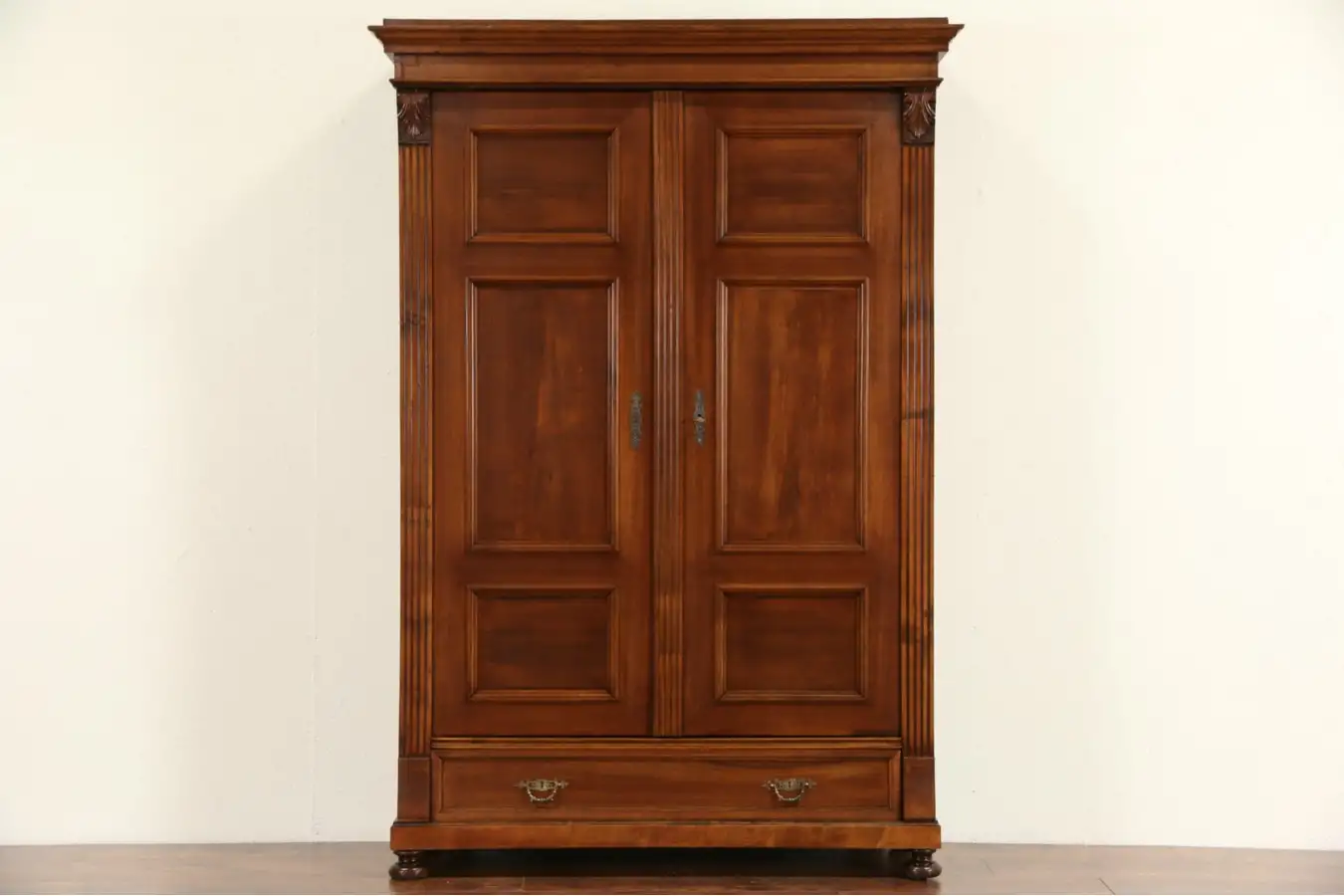 On this antique European furniture, there is a signature on the inside of the left door. Inside is a later wood closet pole that is removable if shelves were to be installed, depth is 16." Measurements are 51" wide, 21" deep and 75" tall.