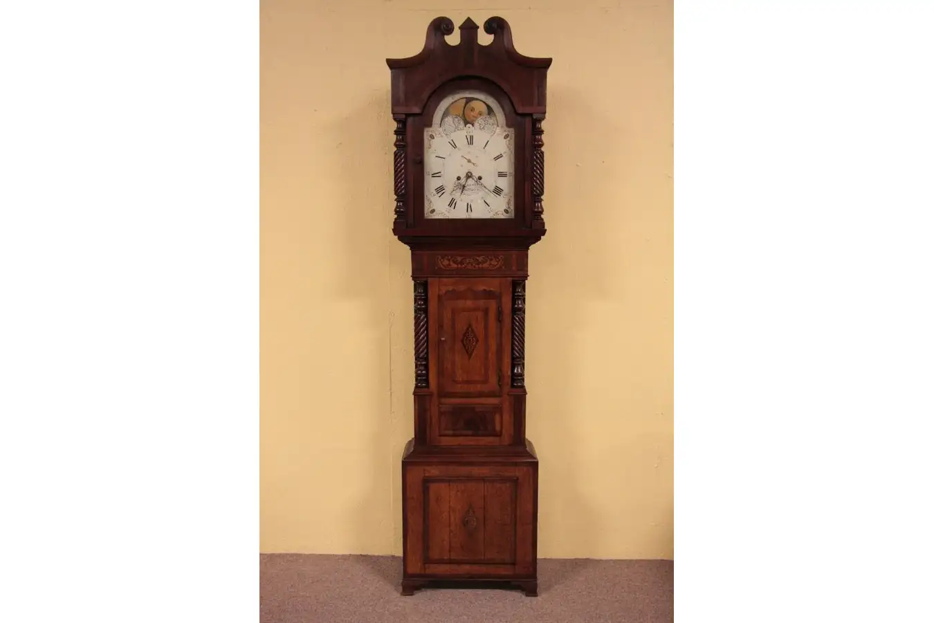 This splendid tall case or grandfather clock was hand made in Pwllheli, Wales about 1790. It has been professionally cleaned and oiled and is in fine running condition. The case artfully mixes mahogany with inlaid marquetry of rosewood and oak. A signature on the handpainted dial is "Jno. Jones, High St., Pwellheli," a charming beachtown on the southern coast of Wales.