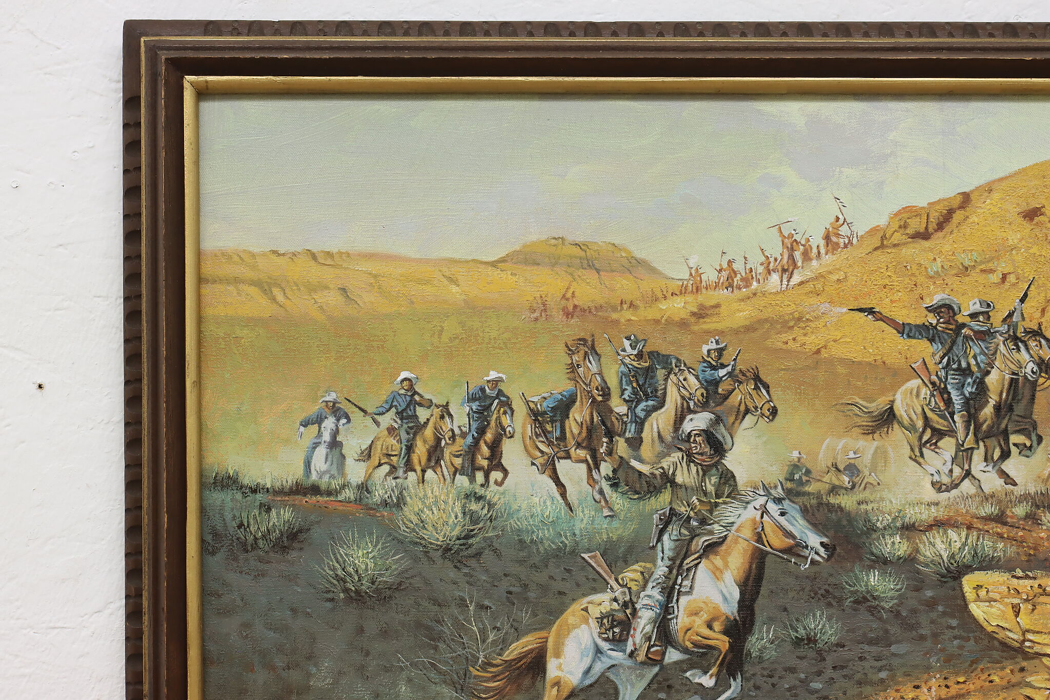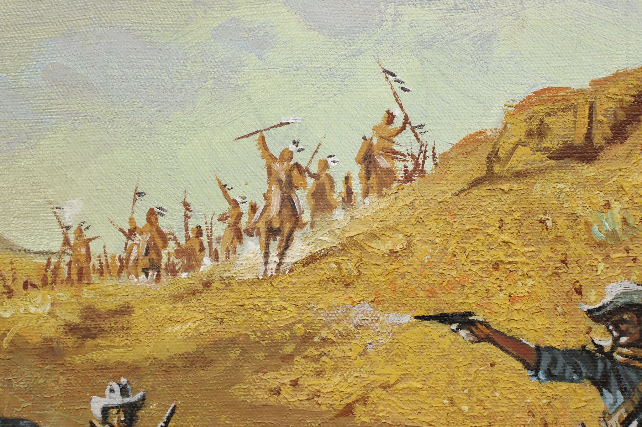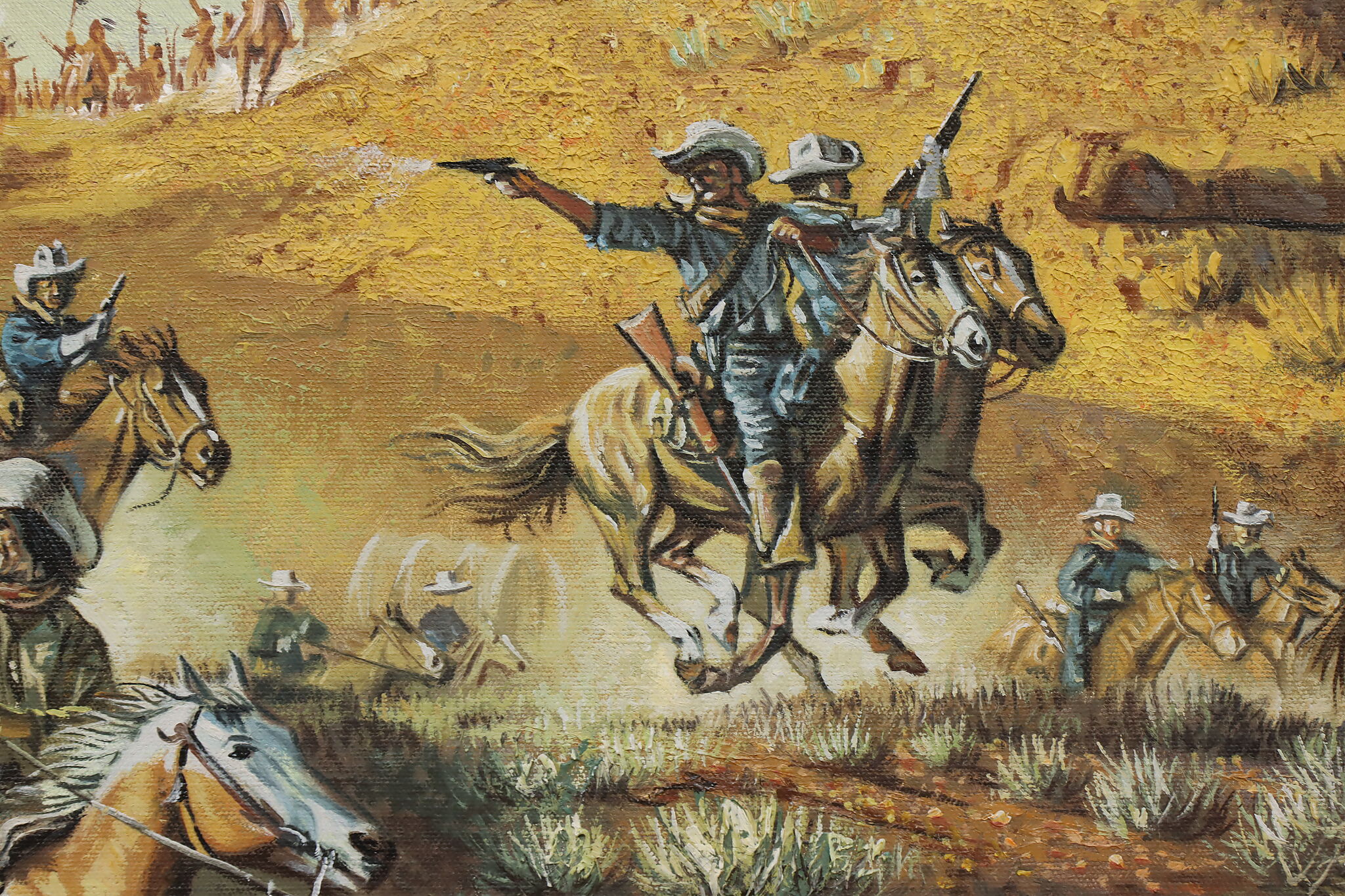 The artist of this painting depicts a battle between the Native American people and the US calvary with fantastic detail.