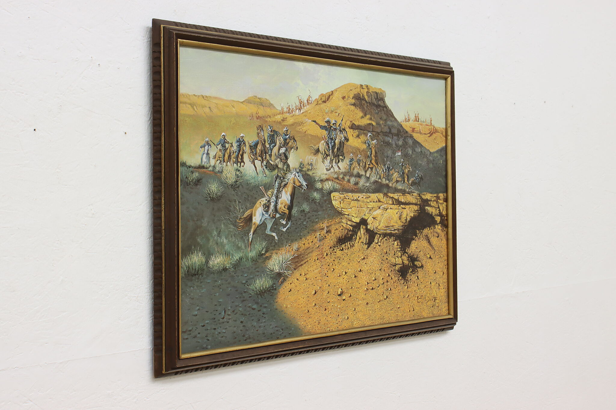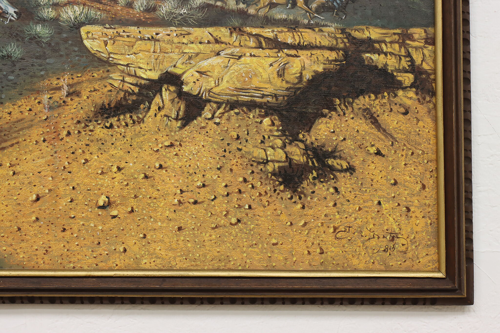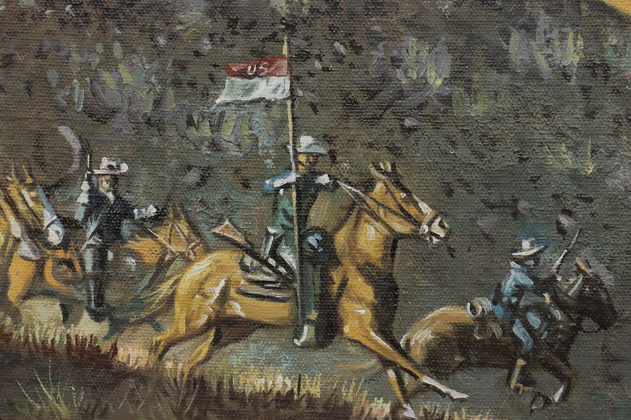 The artist of this painting depicts a battle between the Native American people and the US calvary with fantastic detail.