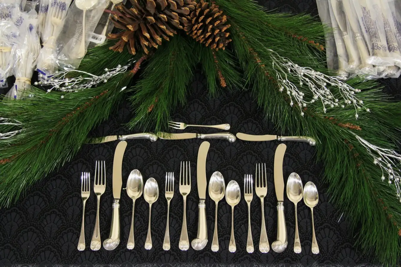 "Pistol Grip" knives have stainless steel blades. Included are twelve each of the following: 9 3/4" dinner knife, 7" butter knife, 6" teaspoon, 6 3/4" soup spoon, 7 1/2" dinner fork, 6 1/2" salad fork and 5 1/4" lemon or seafood fork. There are also a 8 1/4" serving spoon and a 7 3/4" shell ladle.