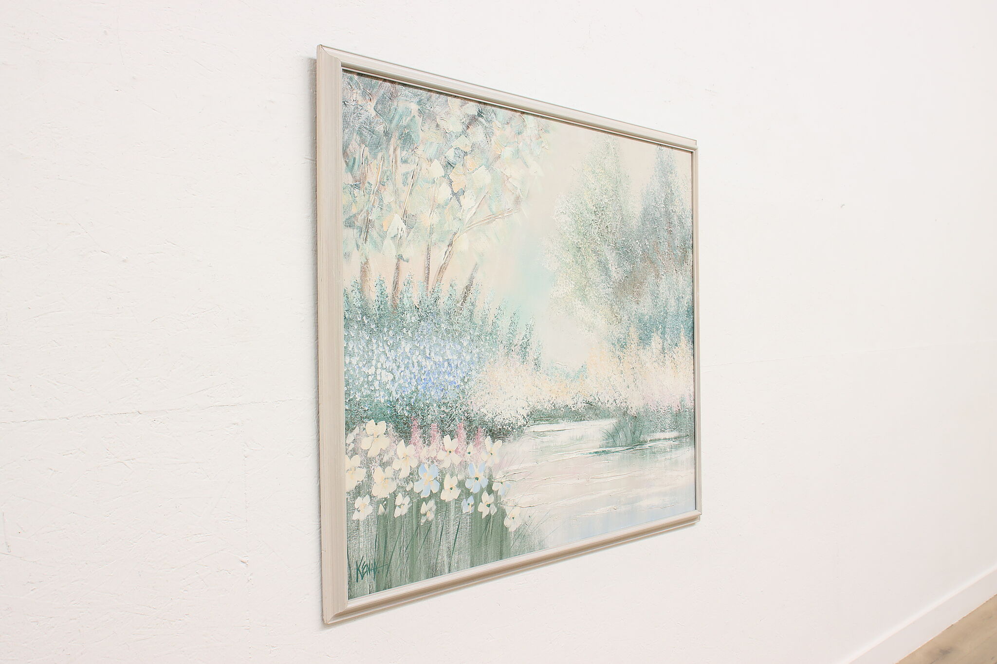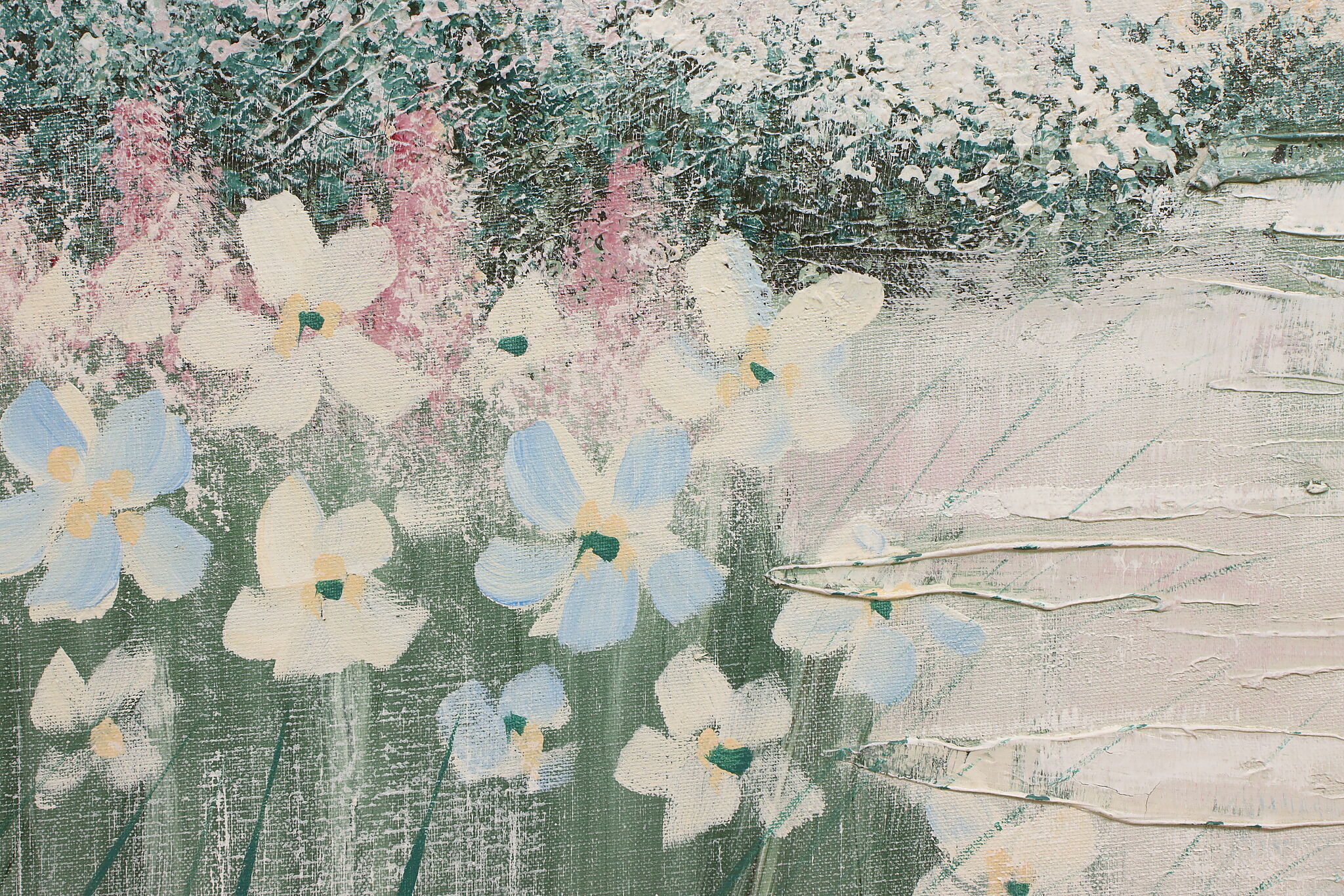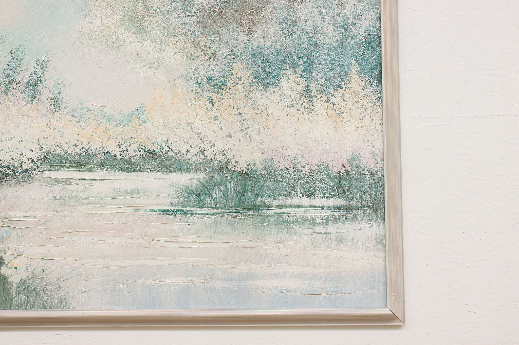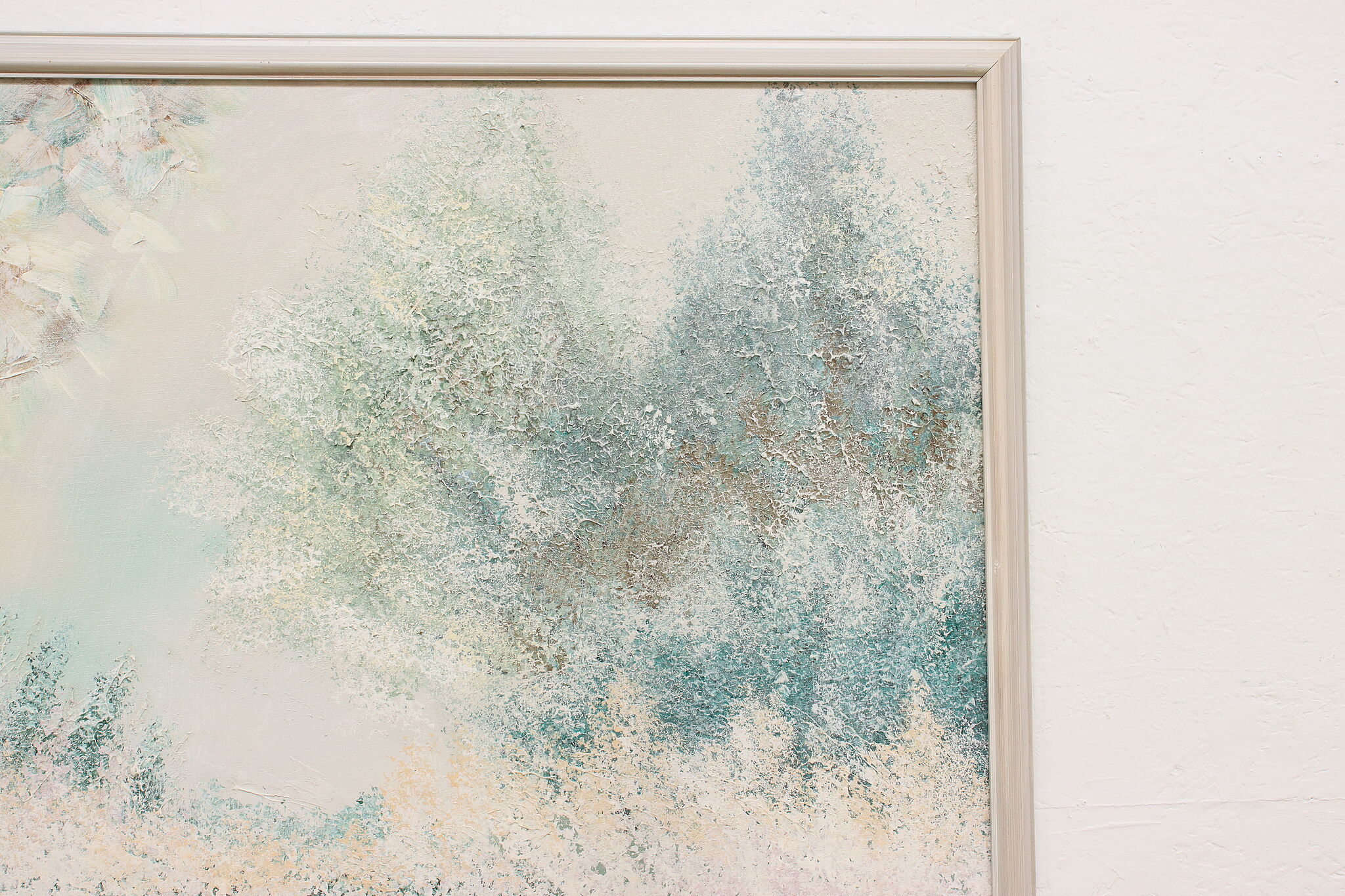 Beautifully painted with pale pastel colors, this unique painting may be of a wintery landscape with blooming flowers.