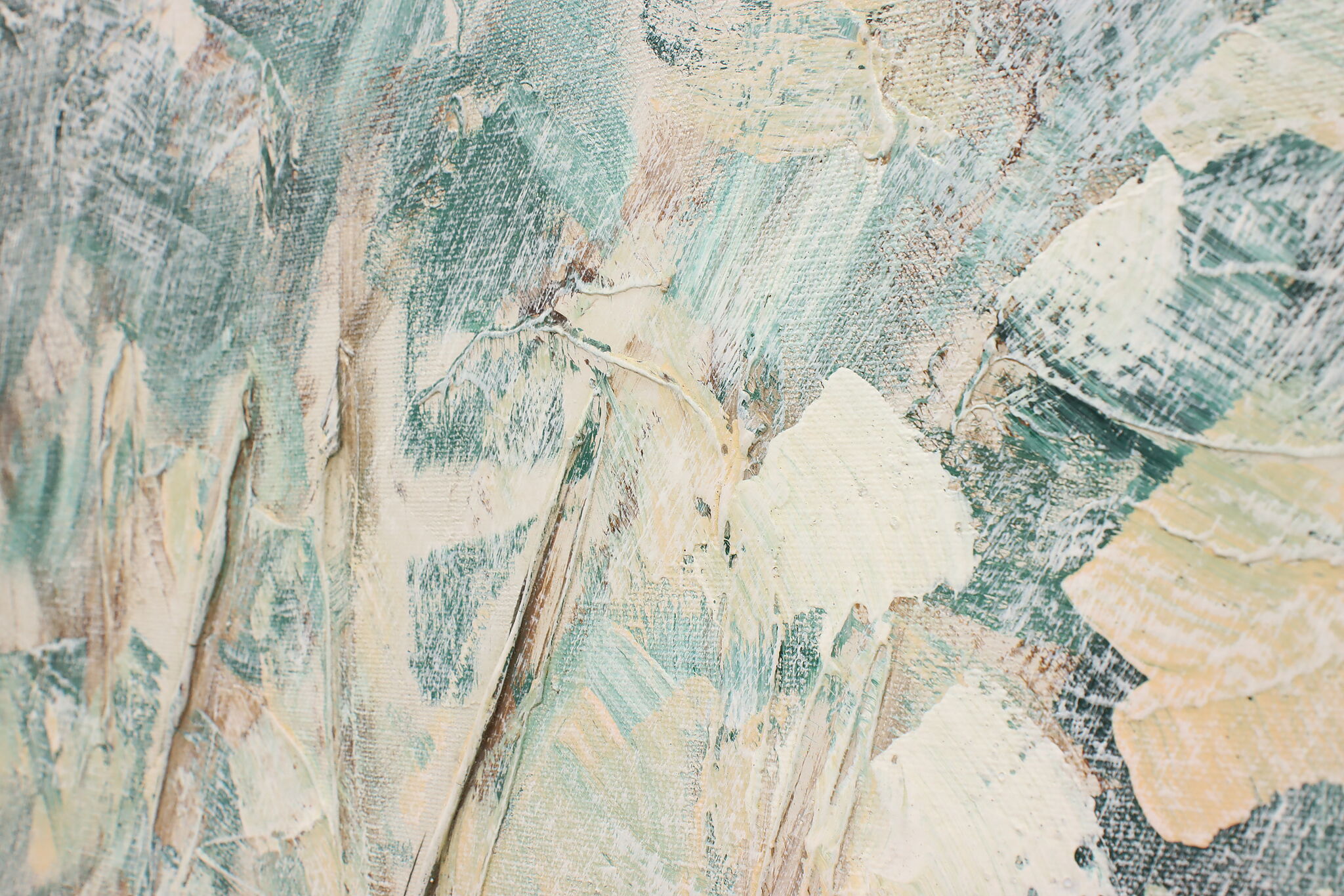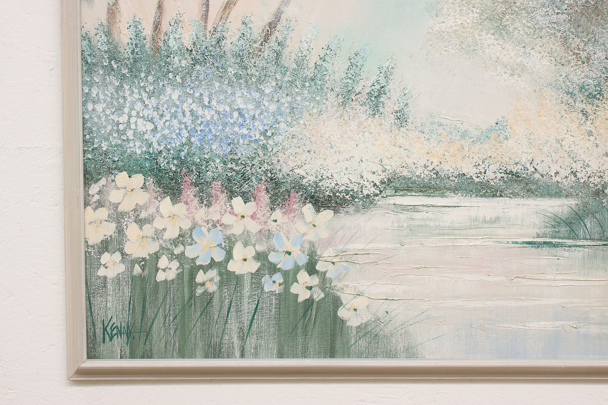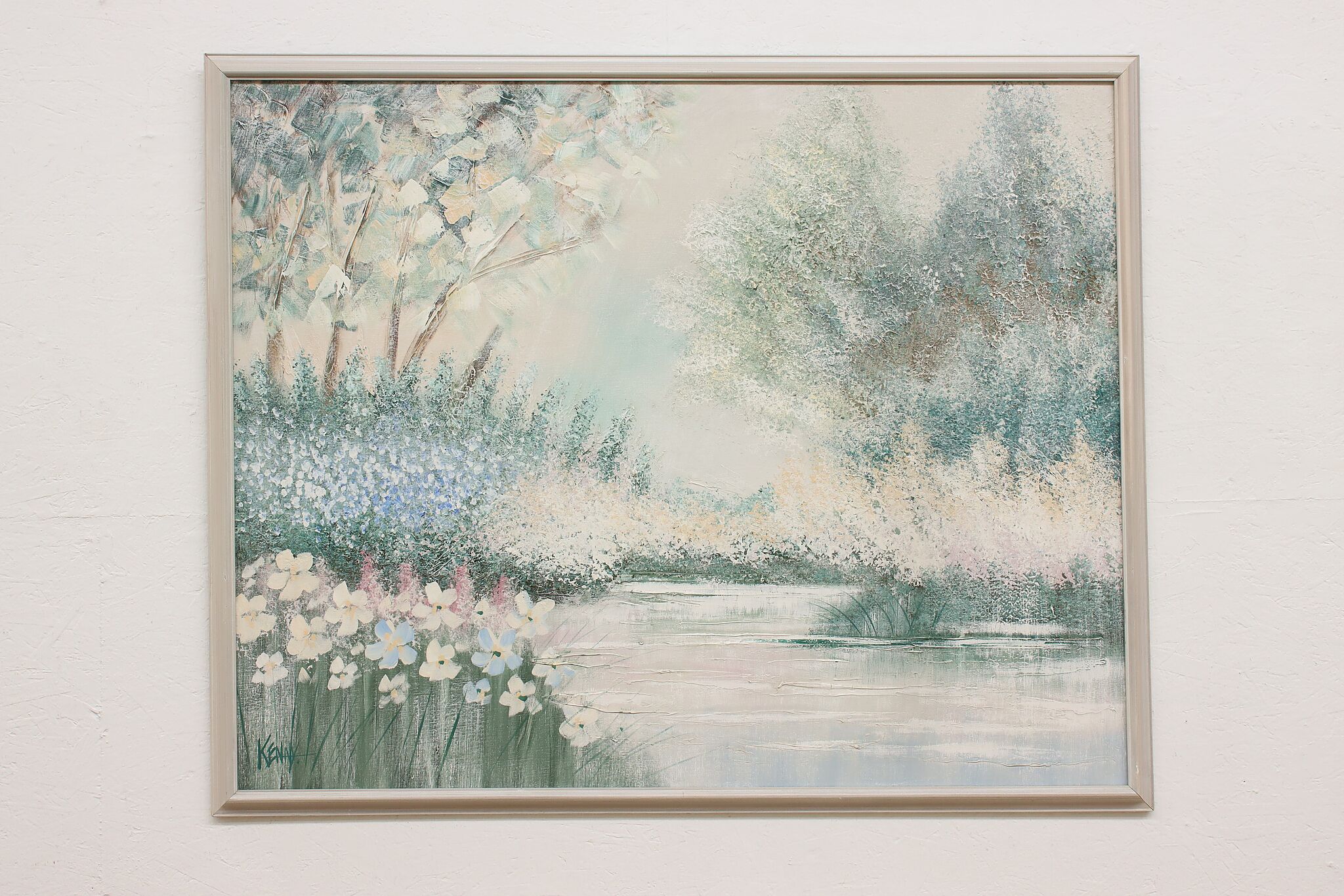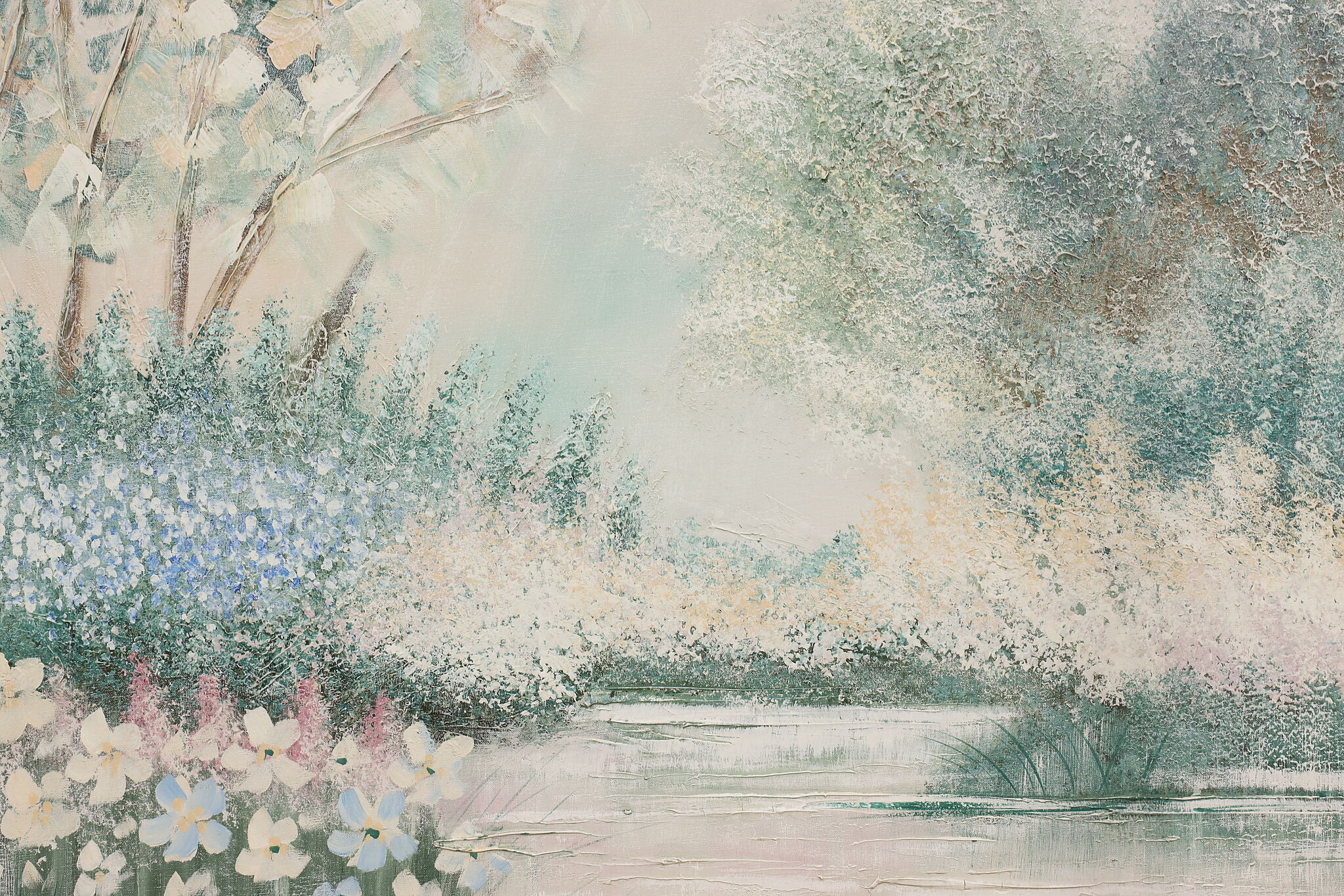 Beautifully painted with pale pastel colors, this unique painting may be of a wintery landscape with blooming flowers.