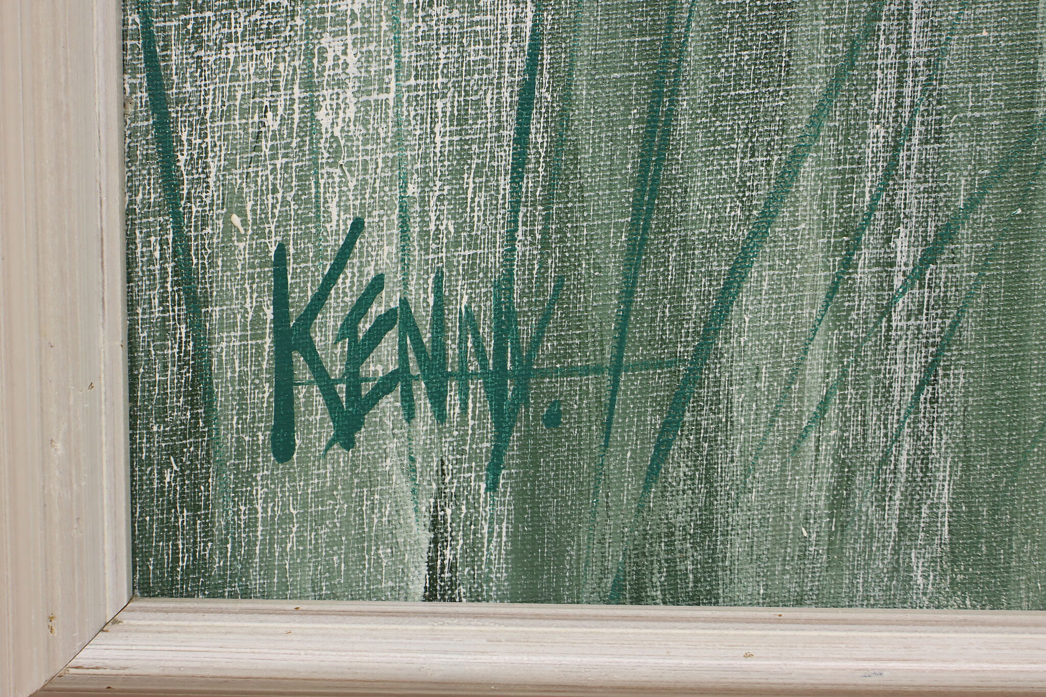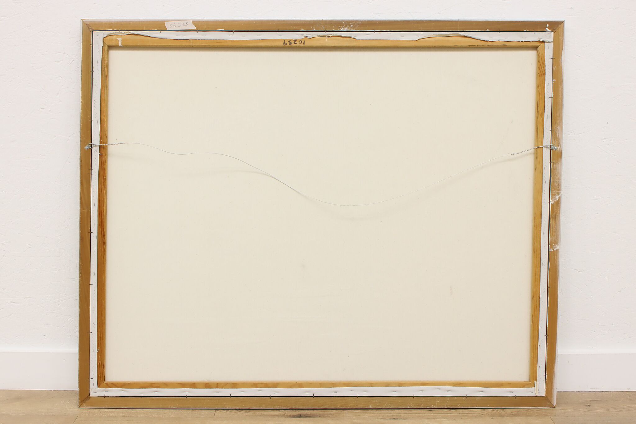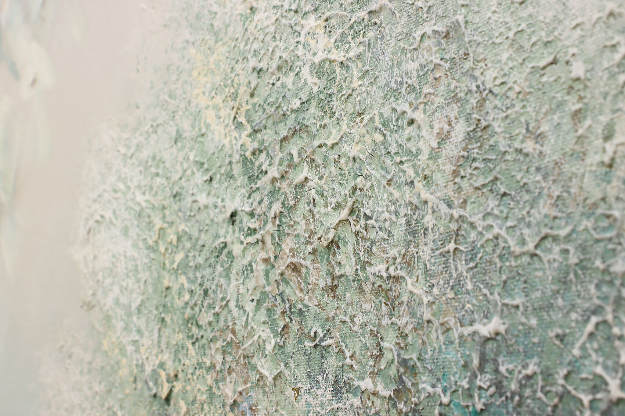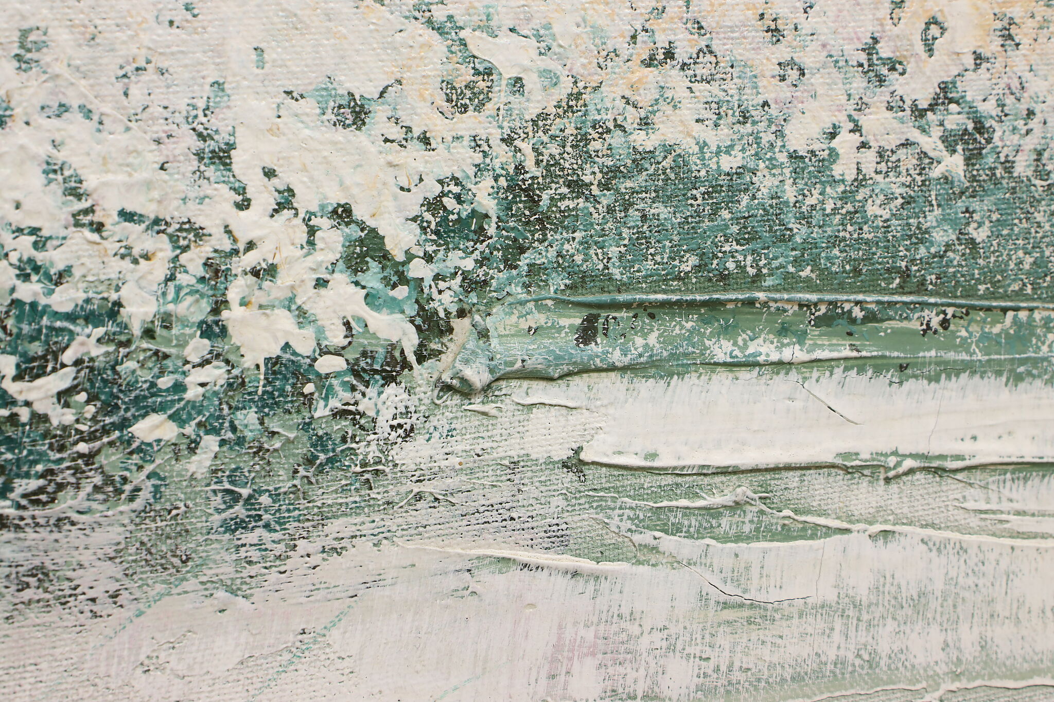 Beautifully painted with pale pastel colors, this unique painting may be of a wintery landscape with blooming flowers.