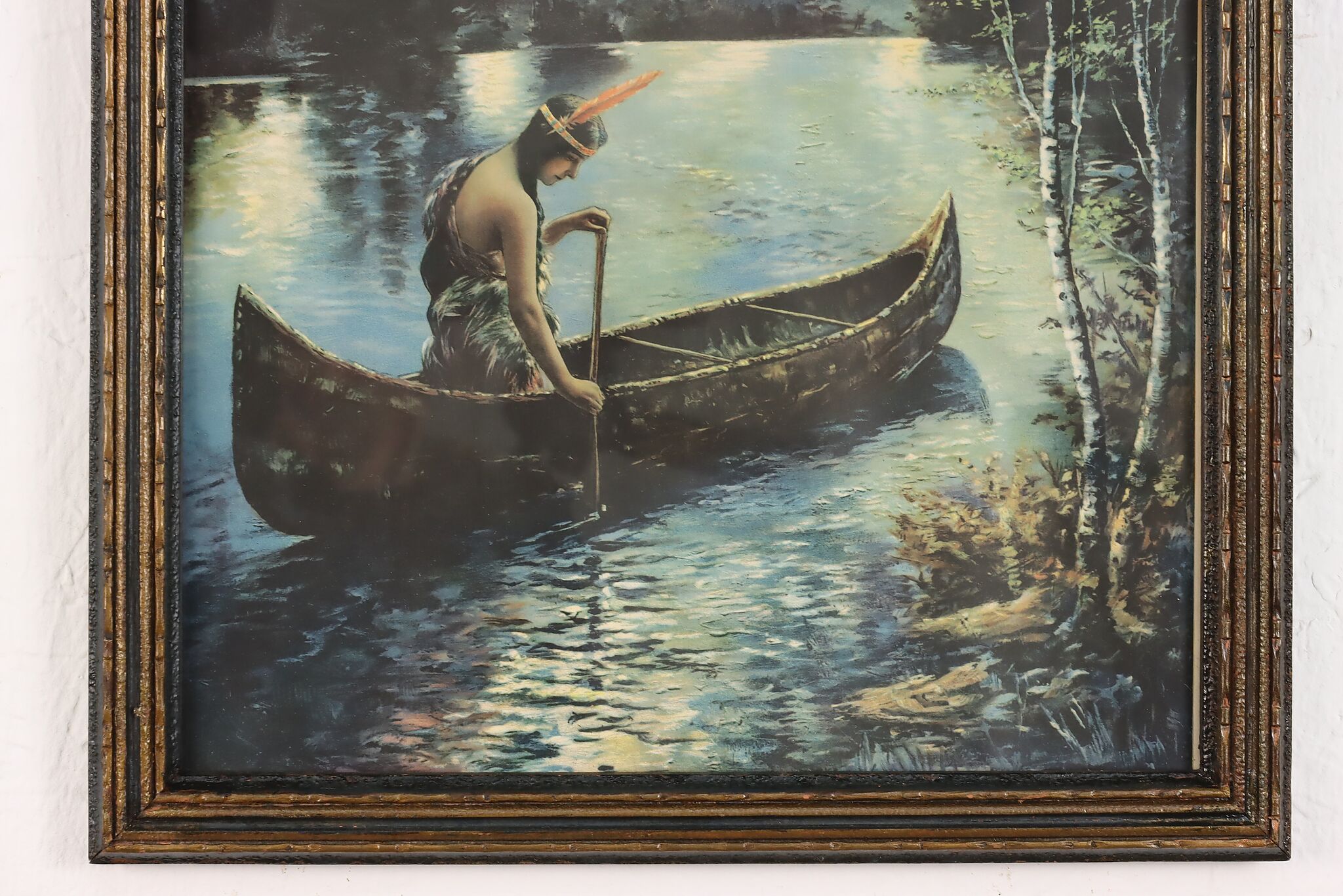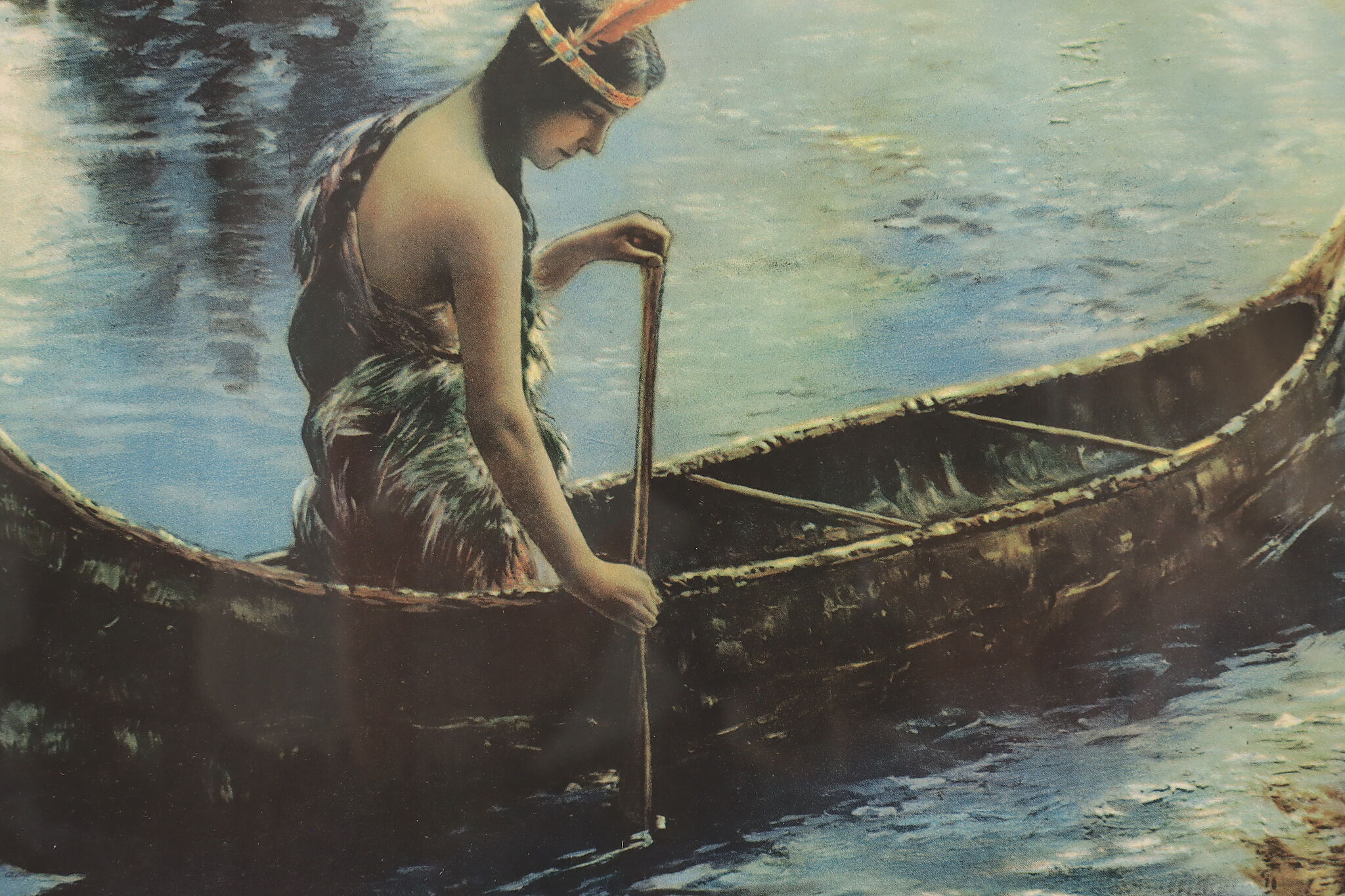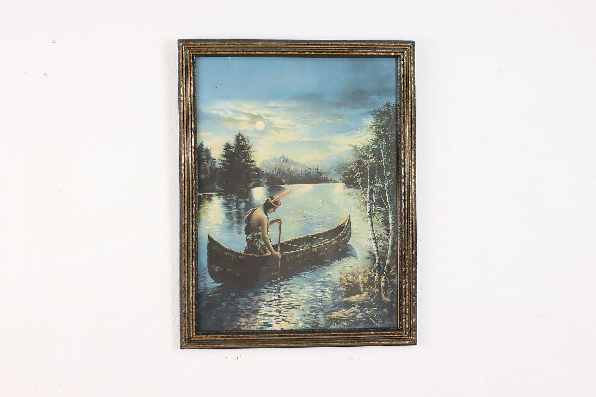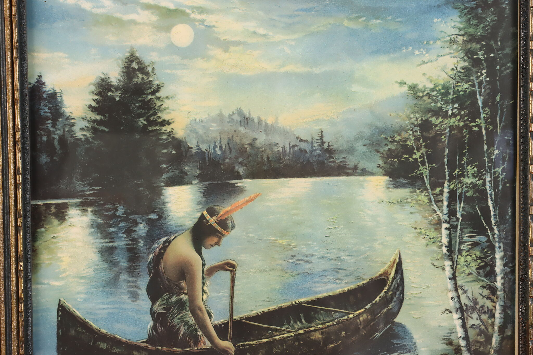 A Native American woman paddles her canoe down a moonlit river in this beautiful lithograph.