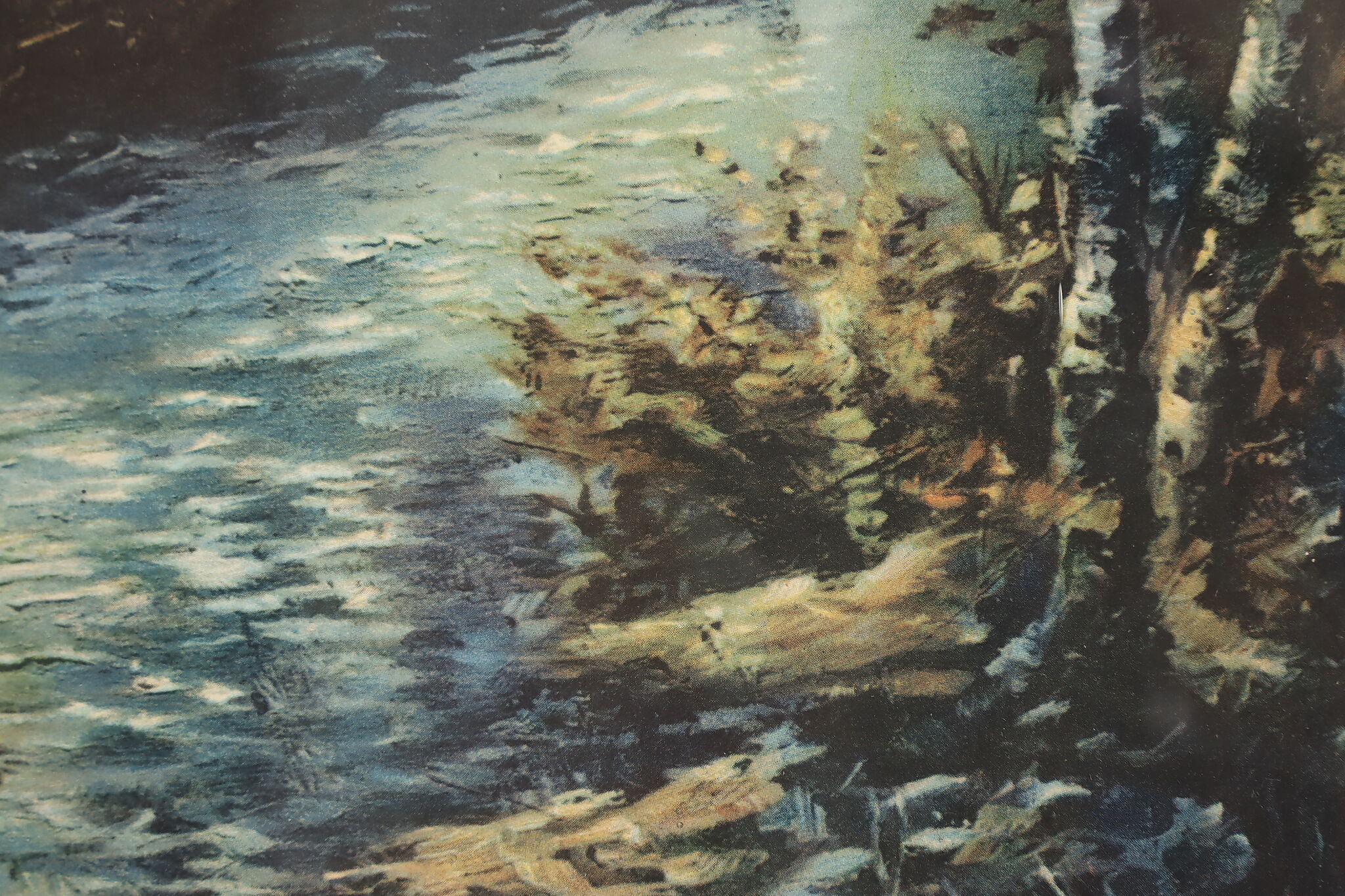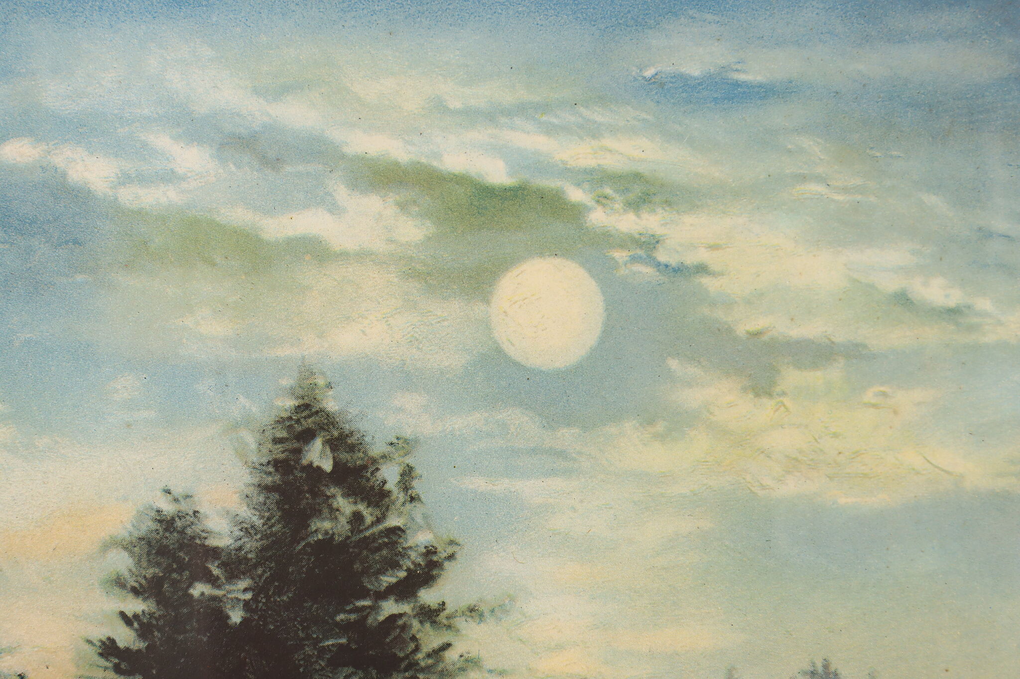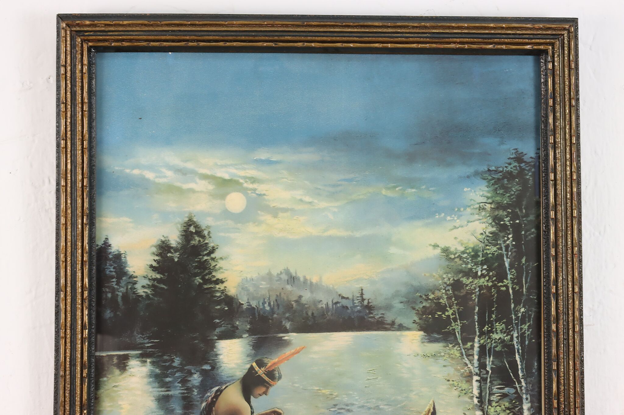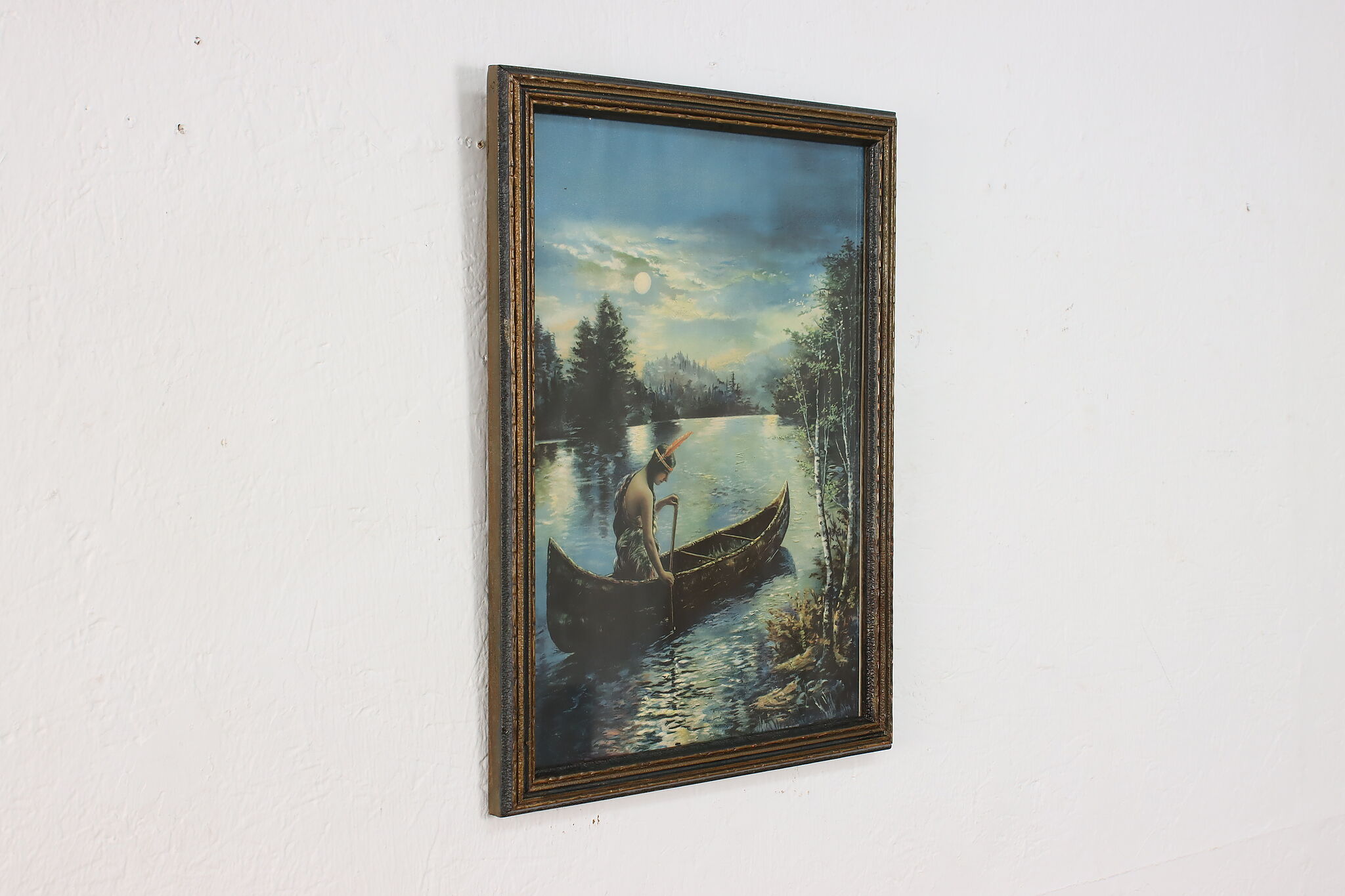 A Native American woman paddles her canoe down a moonlit river in this beautiful lithograph.