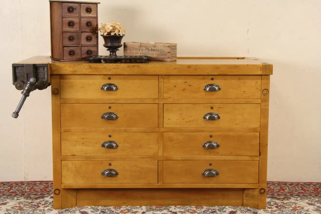 Originally built for a school in Milwaukee around 1925, a rugged maple hardwood workbench would make a great counter, wine tasting table or country kitchen island. The embossed signature reads "Abernathy Tool & Vise Co., Villa Park, IL."