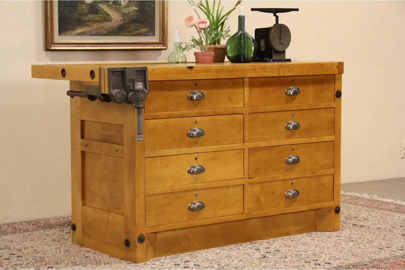 Originally built for a school in Milwaukee around 1925, a rugged maple hardwood workbench would make a great counter, wine tasting table or country kitchen island. The embossed signature reads "Abernathy Tool & Vise Co., Villa Park, IL."