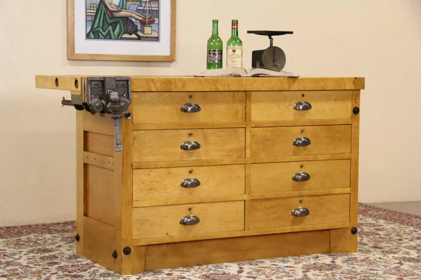 Originally built for a school in Milwaukee around 1925, a rugged maple hardwood workbench would make a great counter, wine tasting table or country kitchen island. The embossed signature reads "Abernathy Tool & Vise Co., Villa Park, IL."