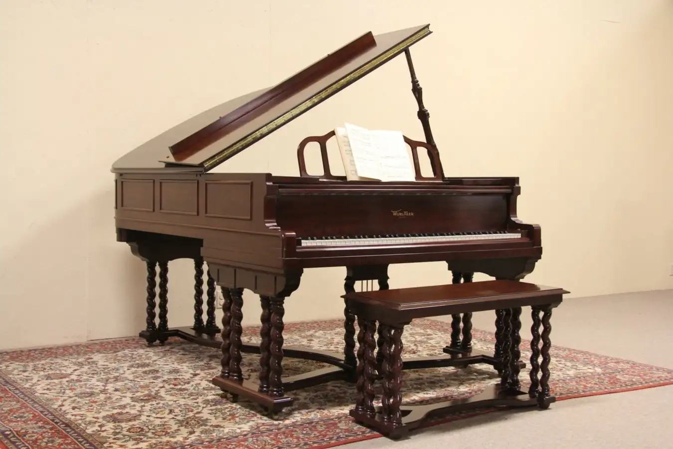The mahogany art case of this 1926 "Wurlitzer" grand piano has been restored and the piano action rebuilt as well about 20 years ago.