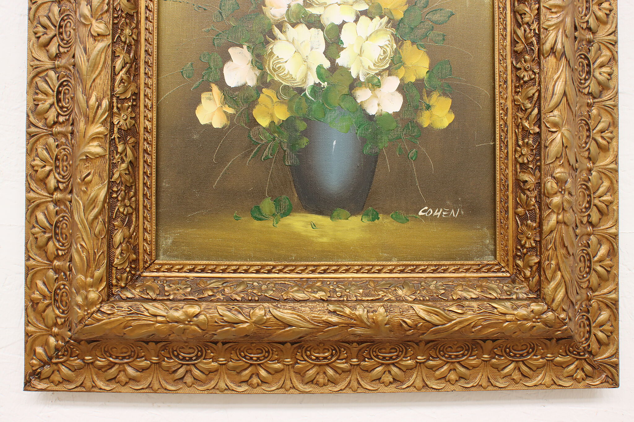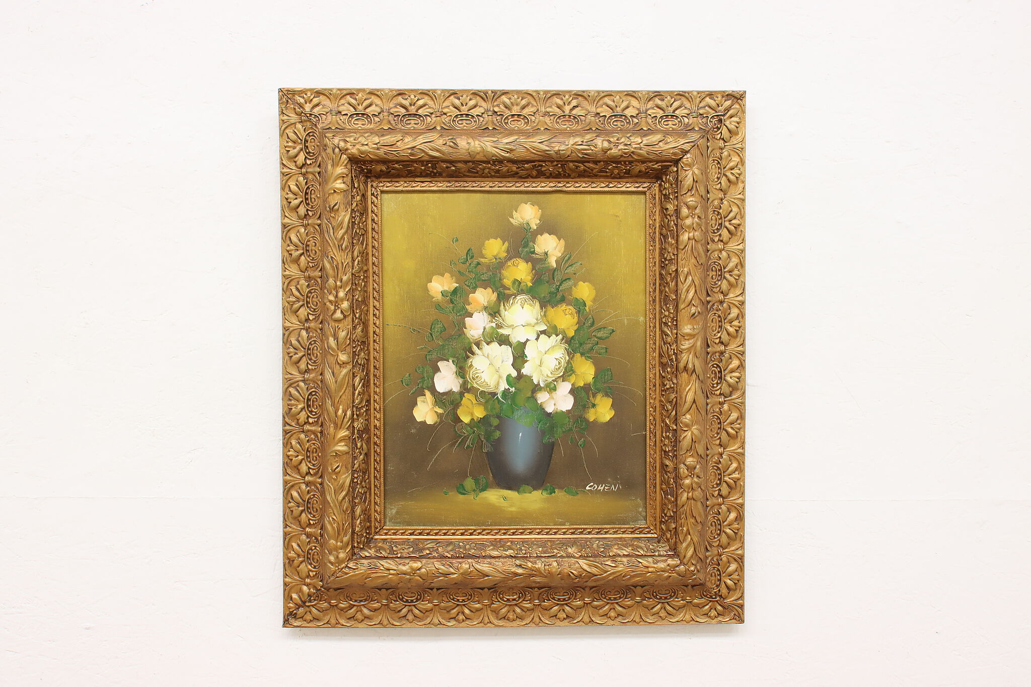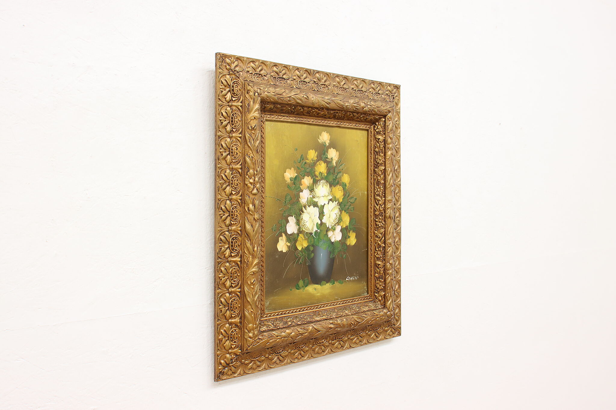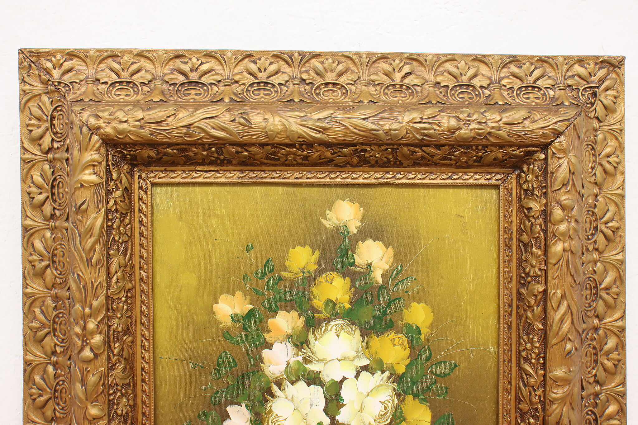 This still life of a vase of yellow and white flowers has a beautiful dark gold frame with leaf and floral motifs.
