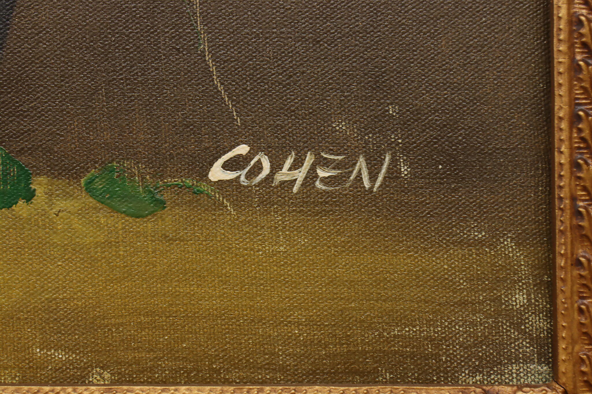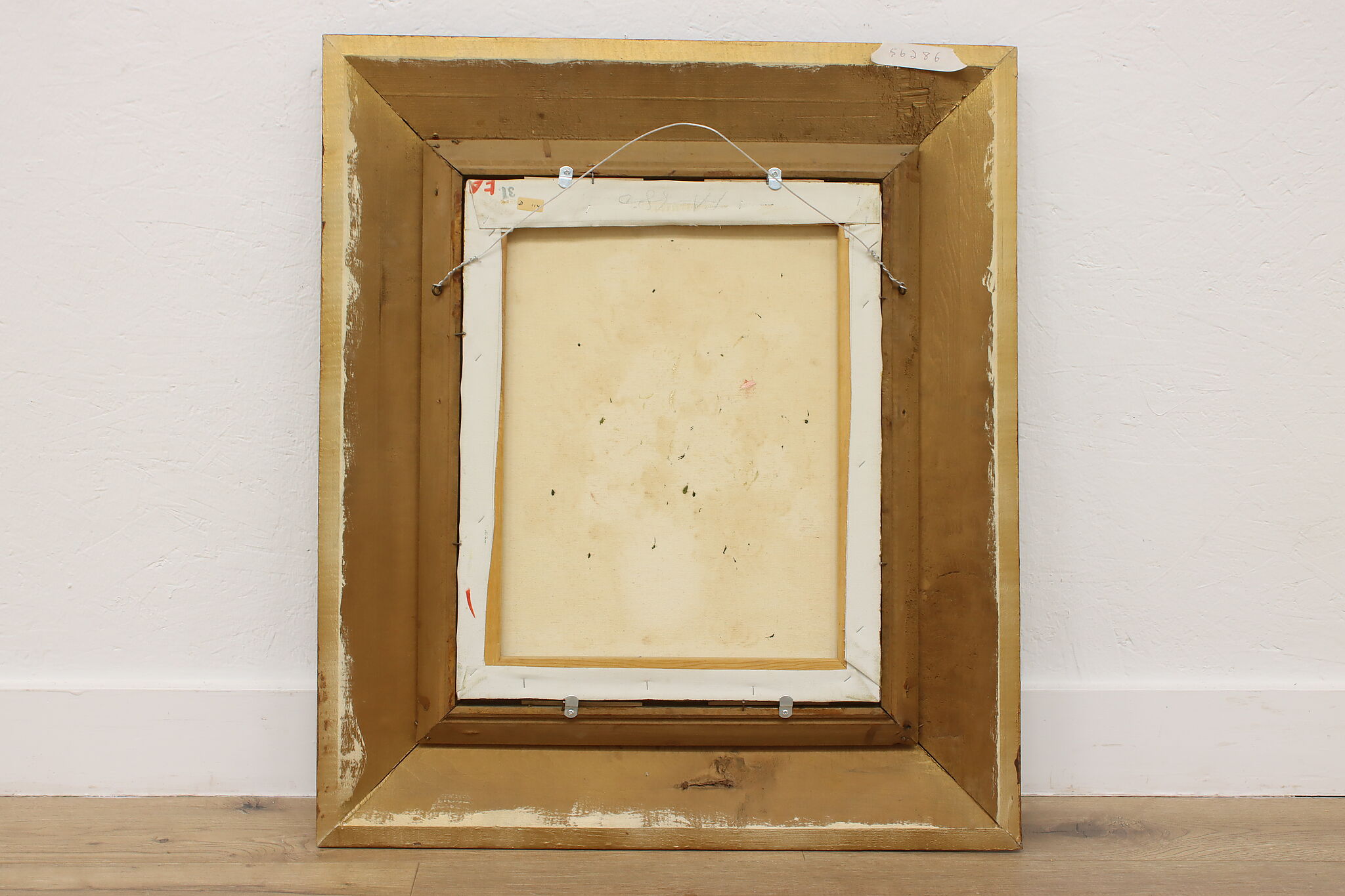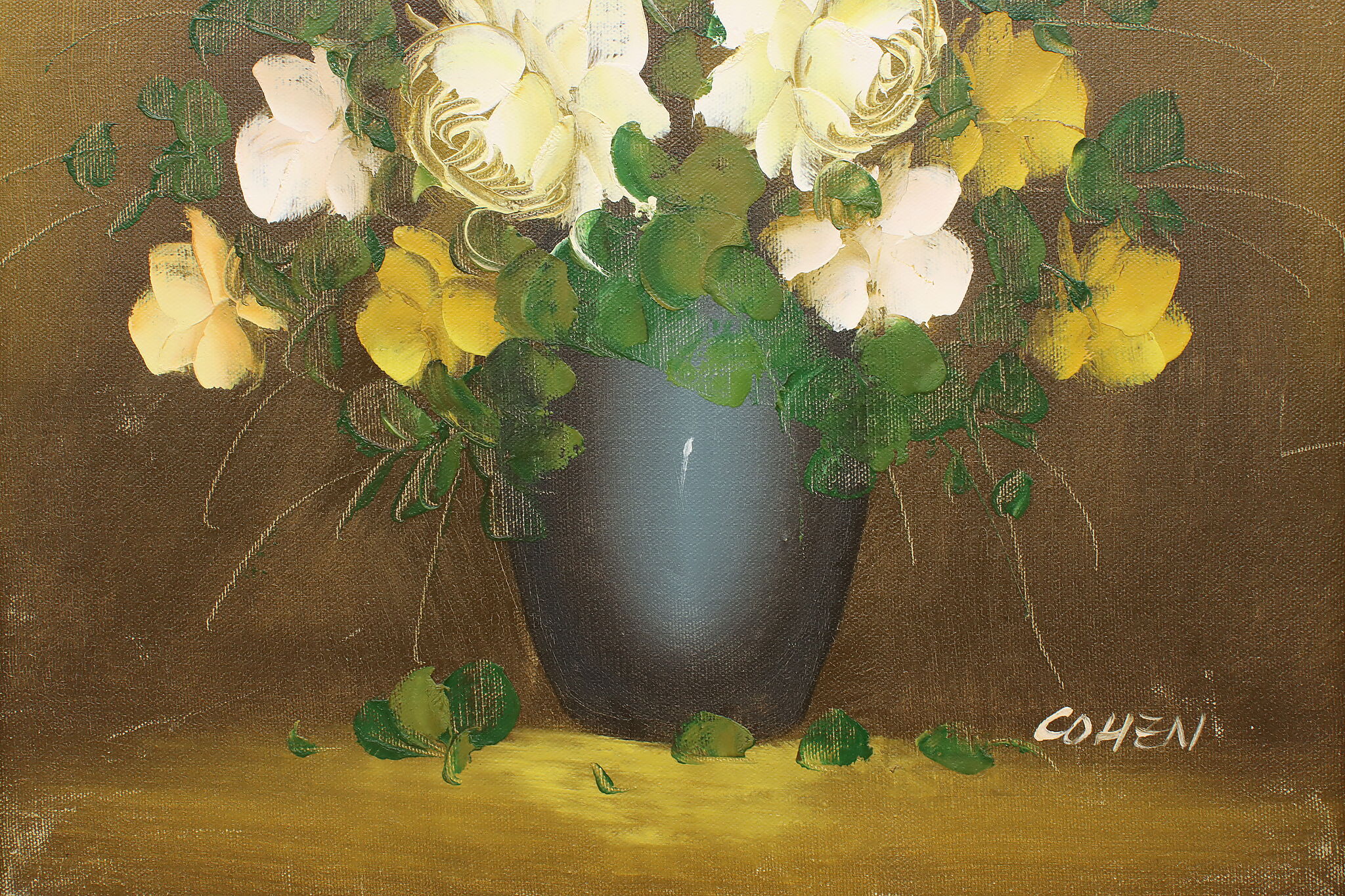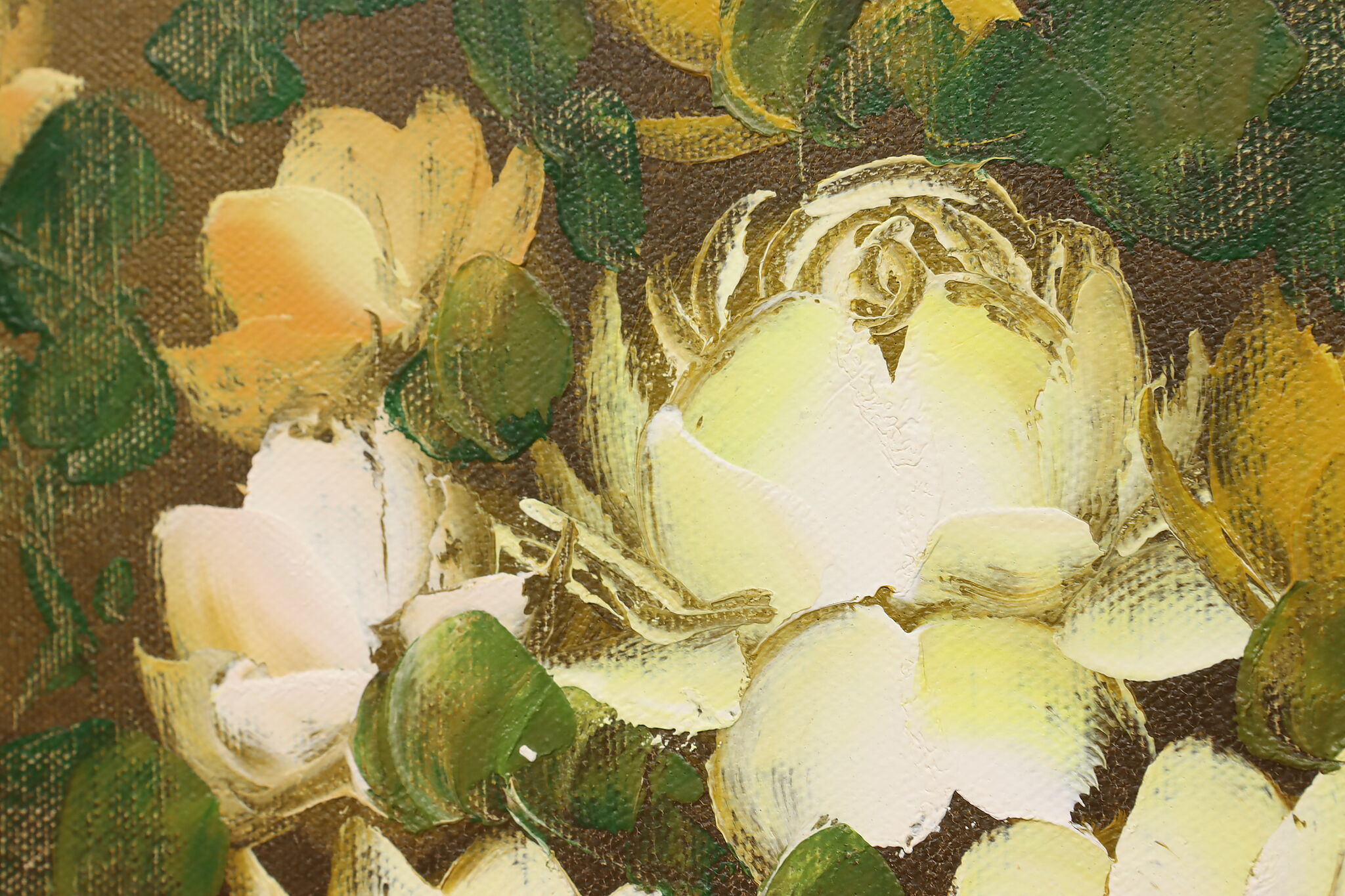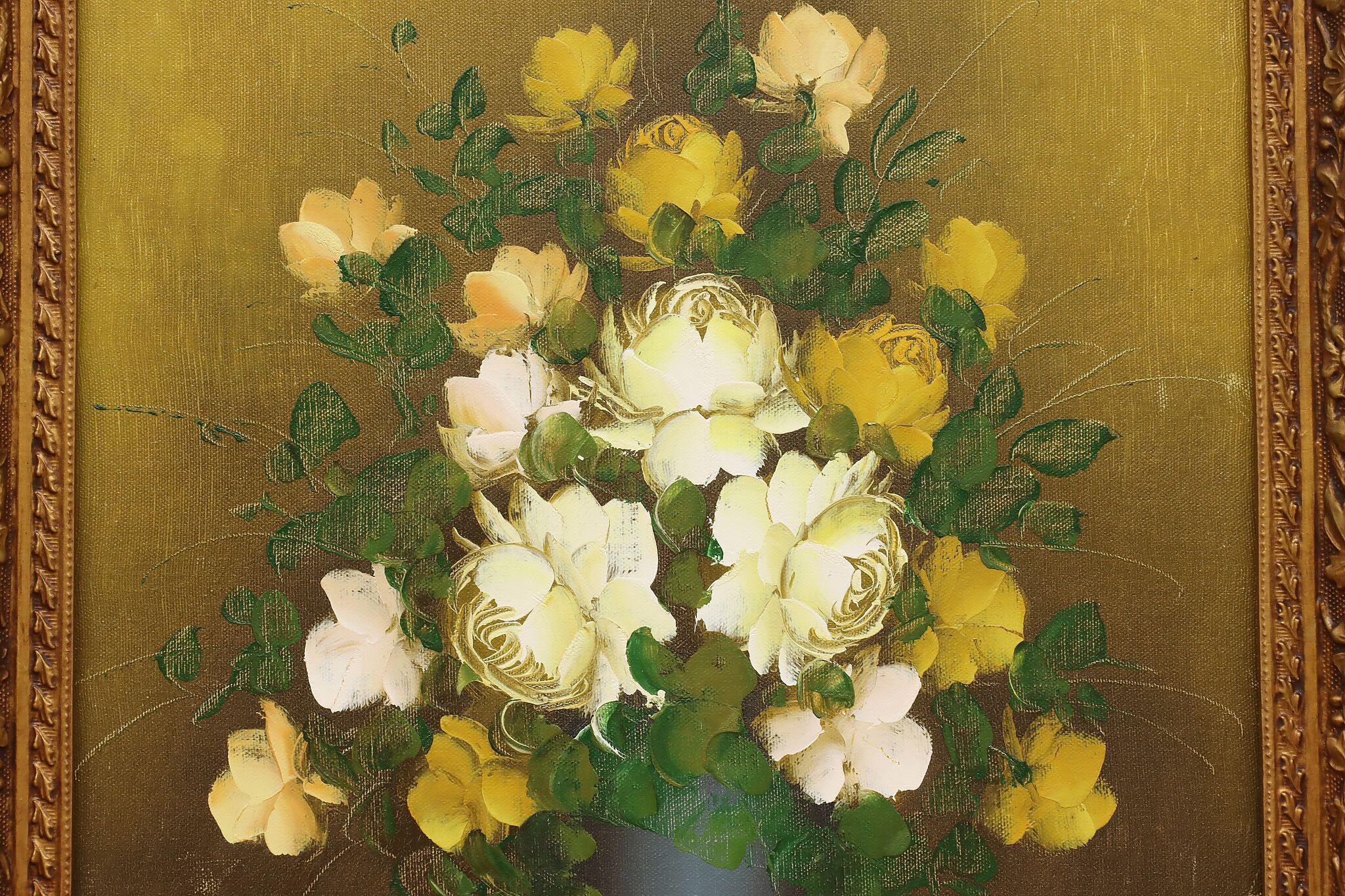 This still life of a vase of yellow and white flowers has a beautiful dark gold frame with leaf and floral motifs.