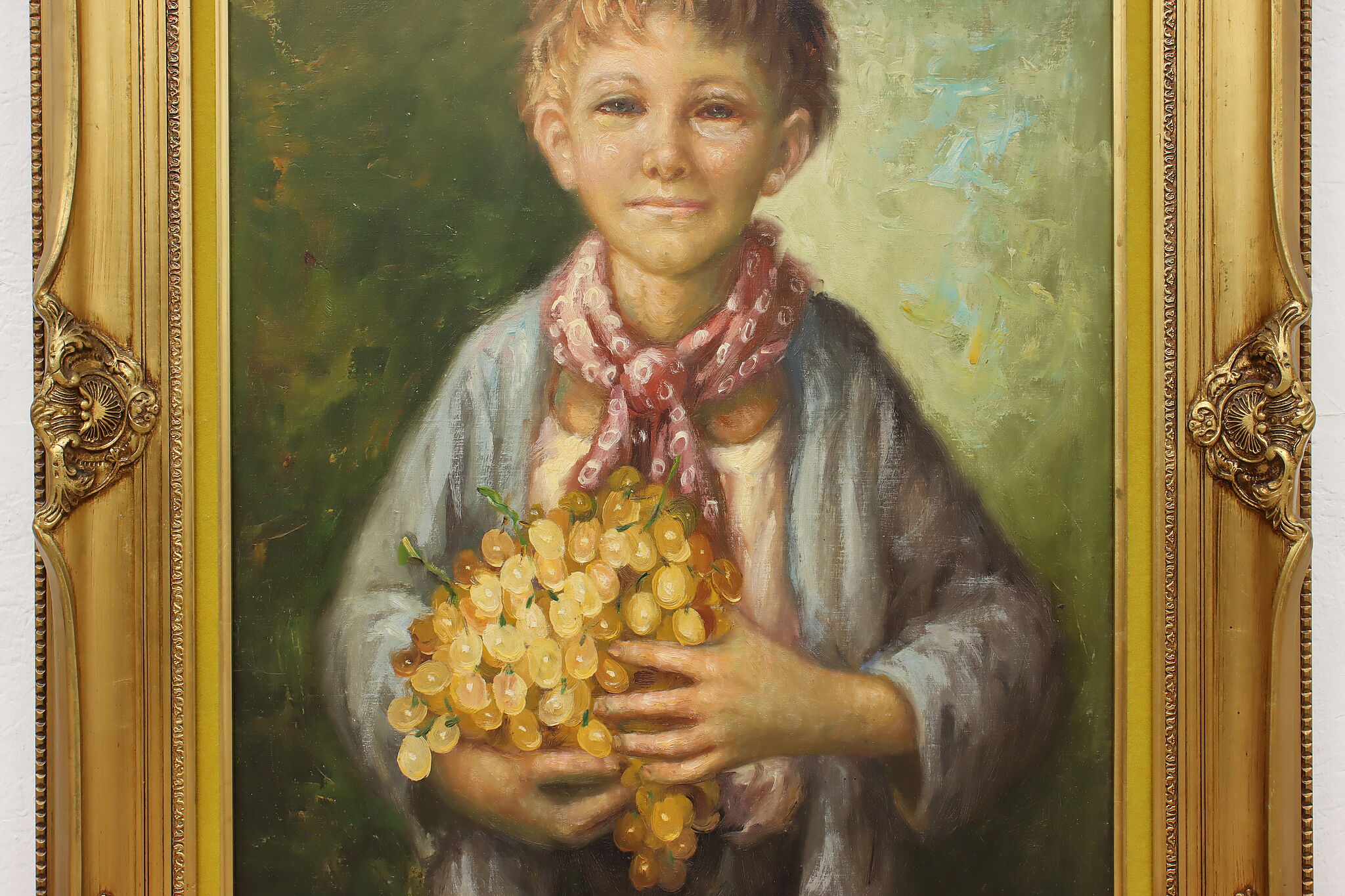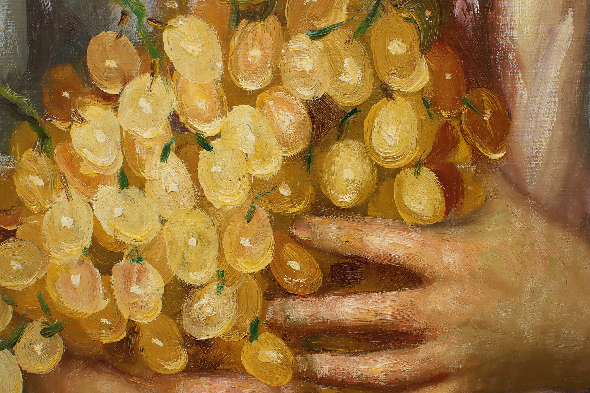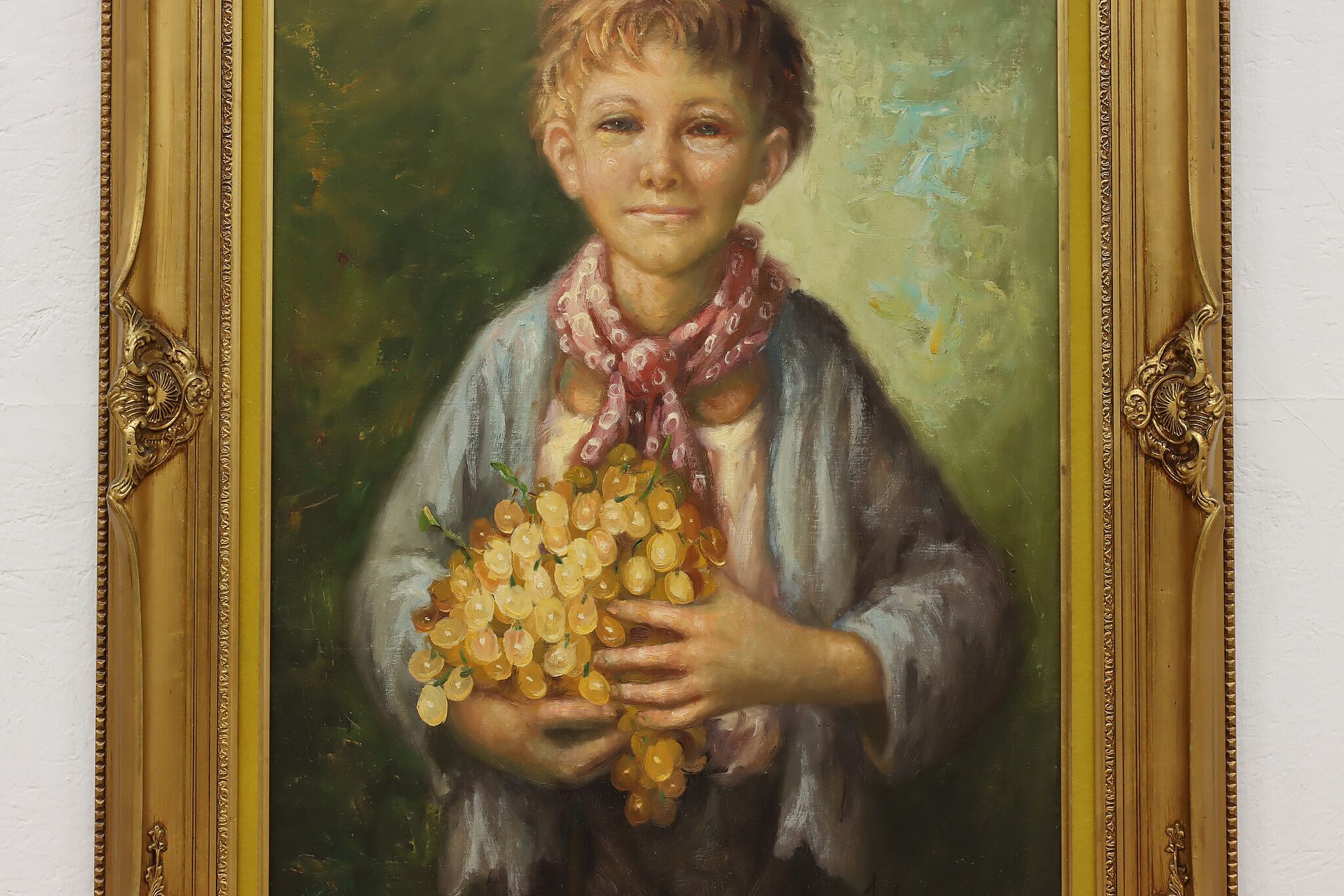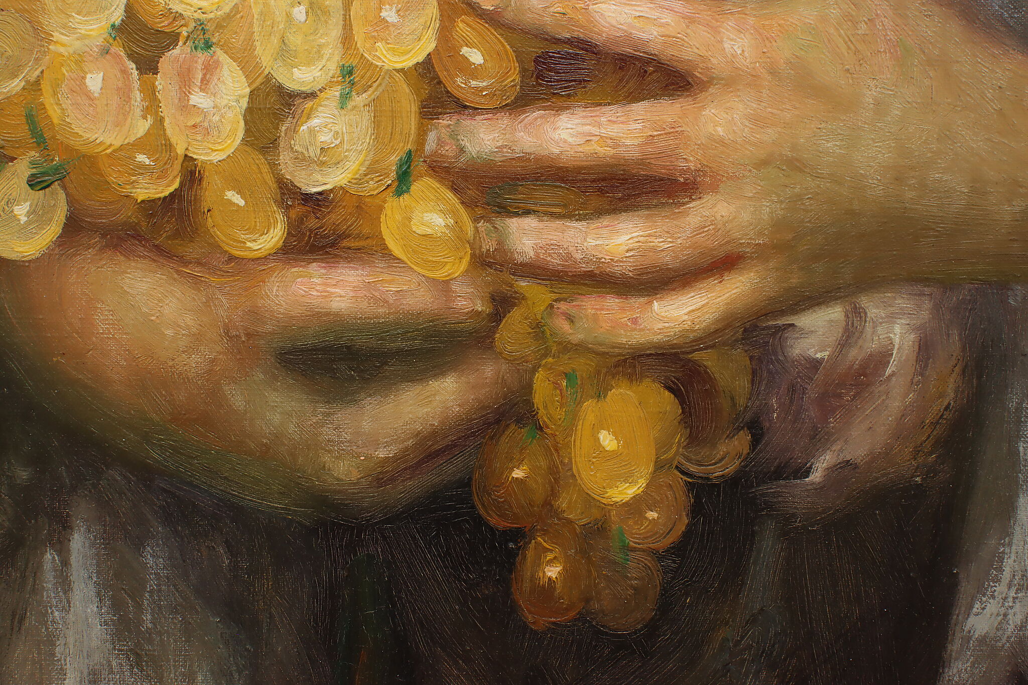 A young boy patiently waits for his portrait to be painted while holding a freshly picked bundle of grapes.