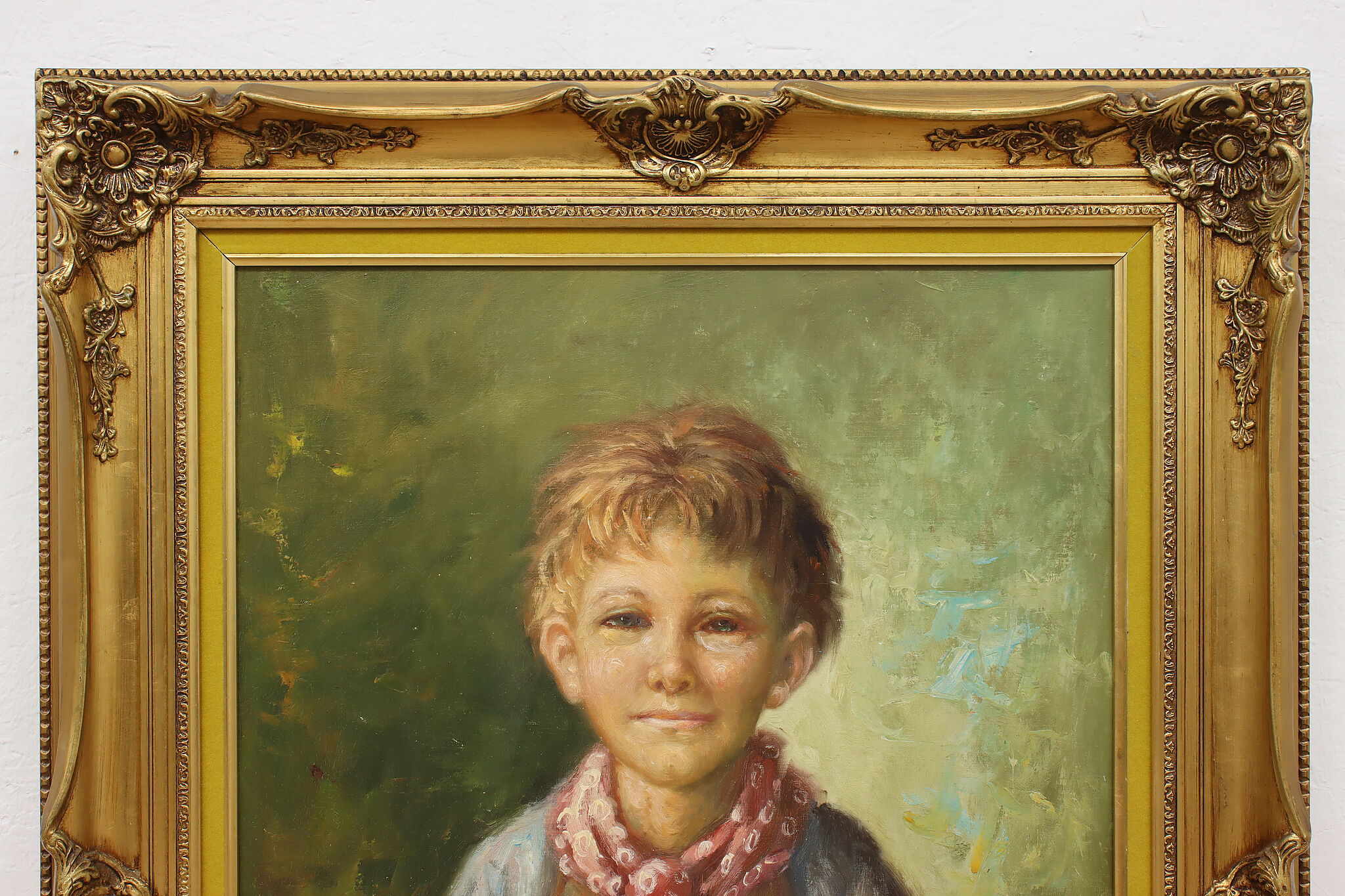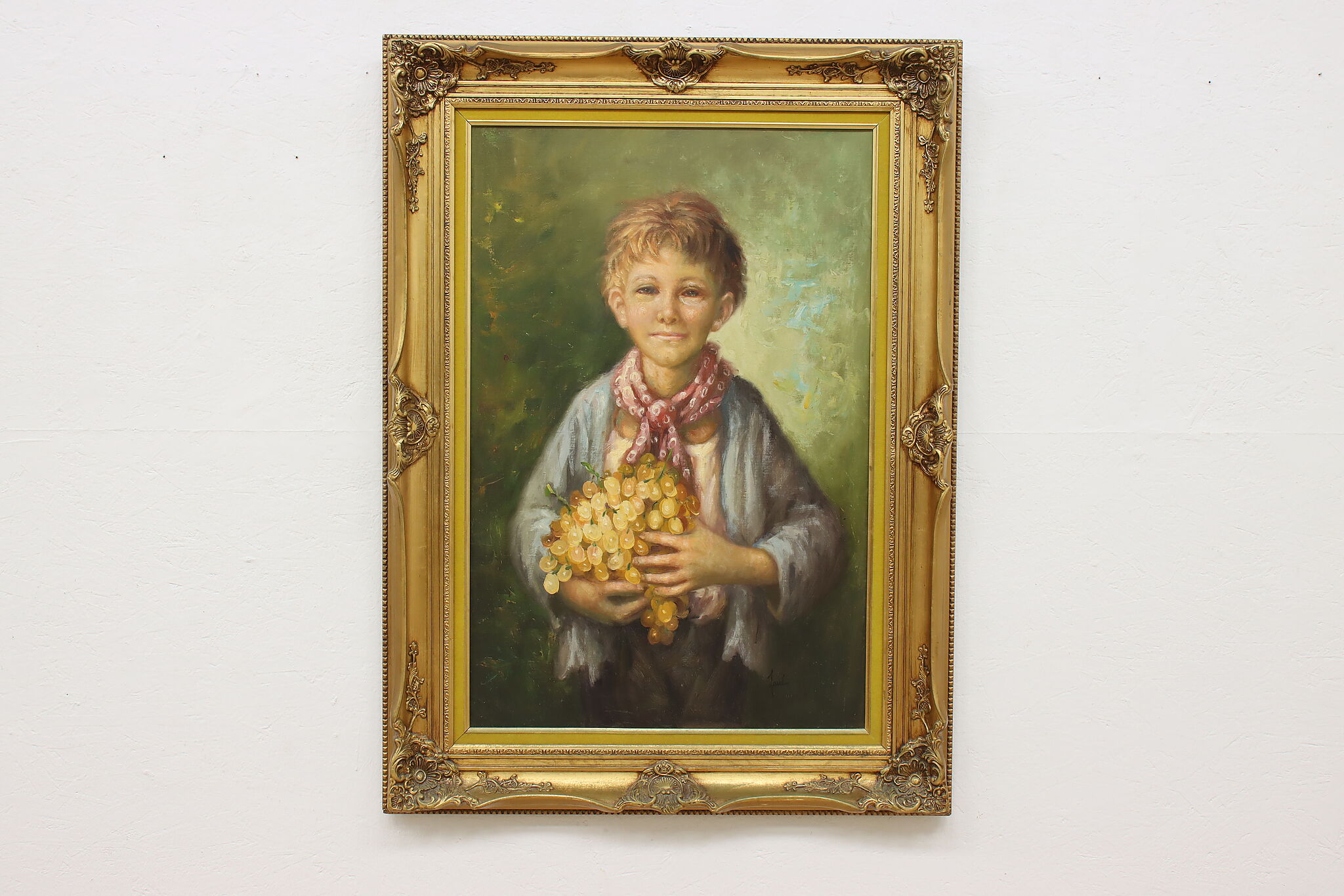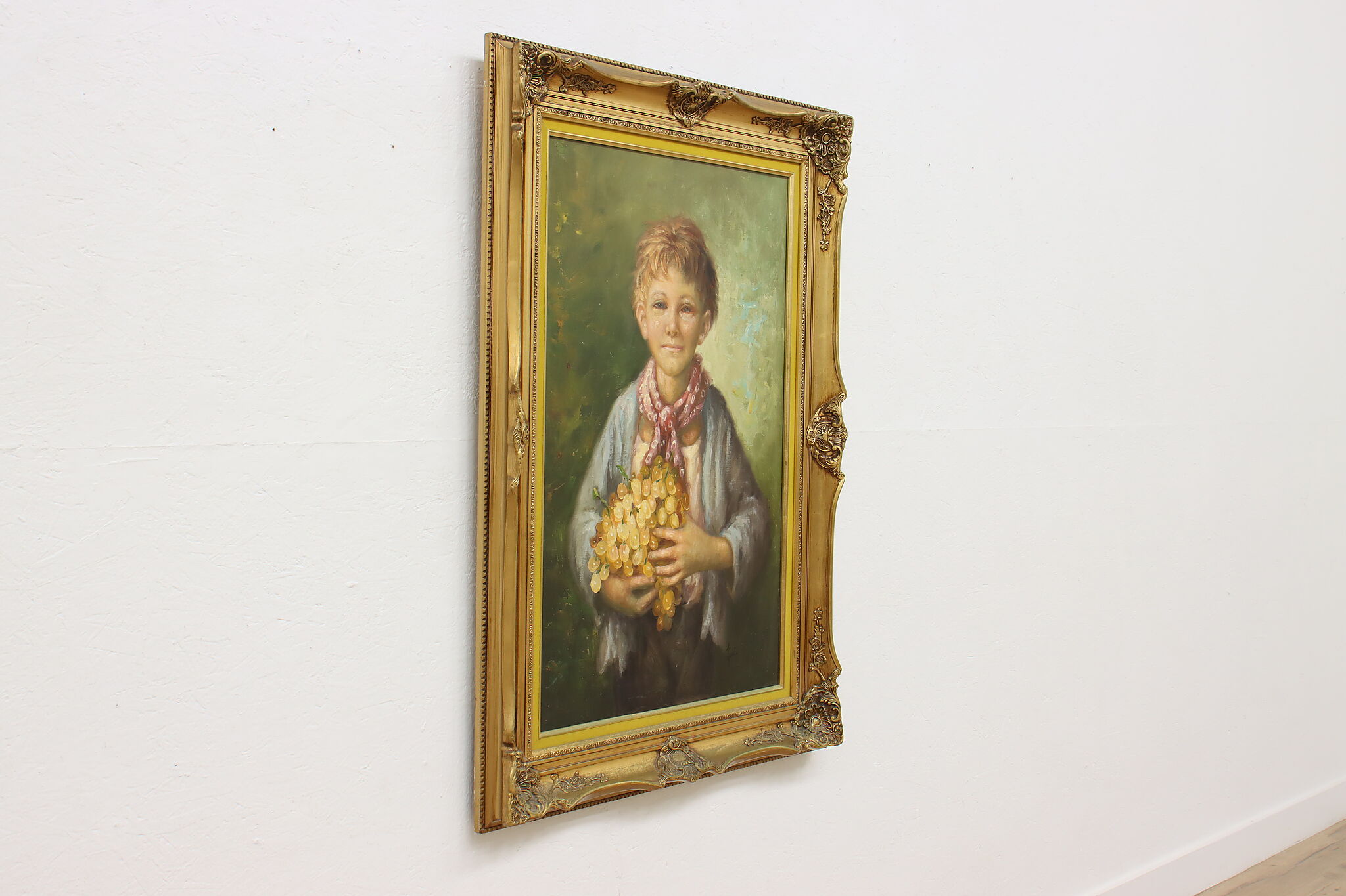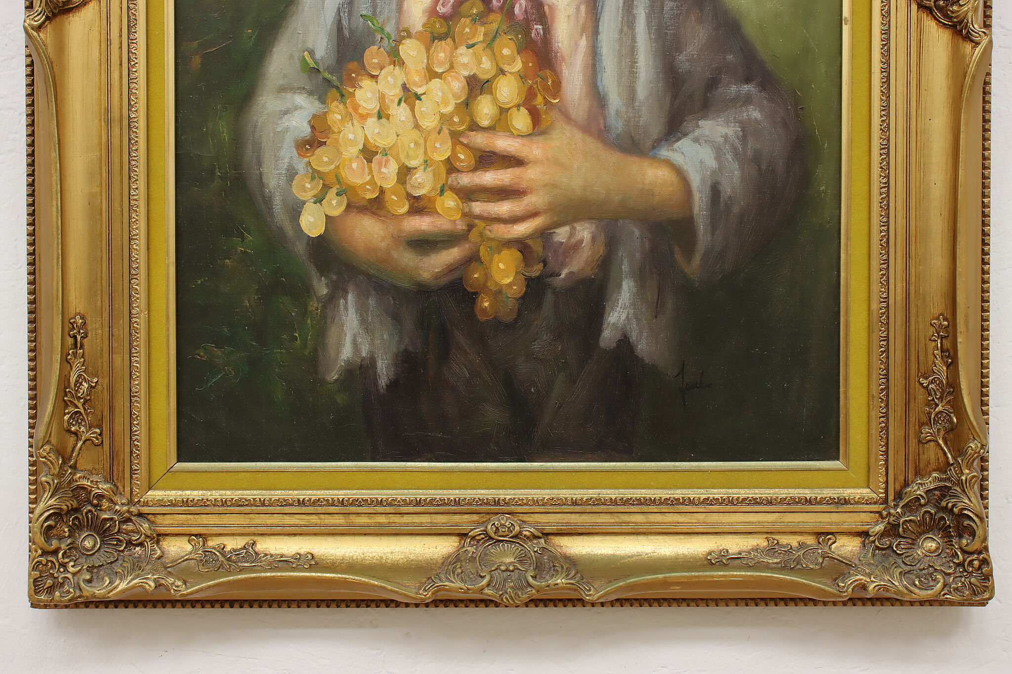 A young boy patiently waits for his portrait to be painted while holding a freshly picked bundle of grapes.