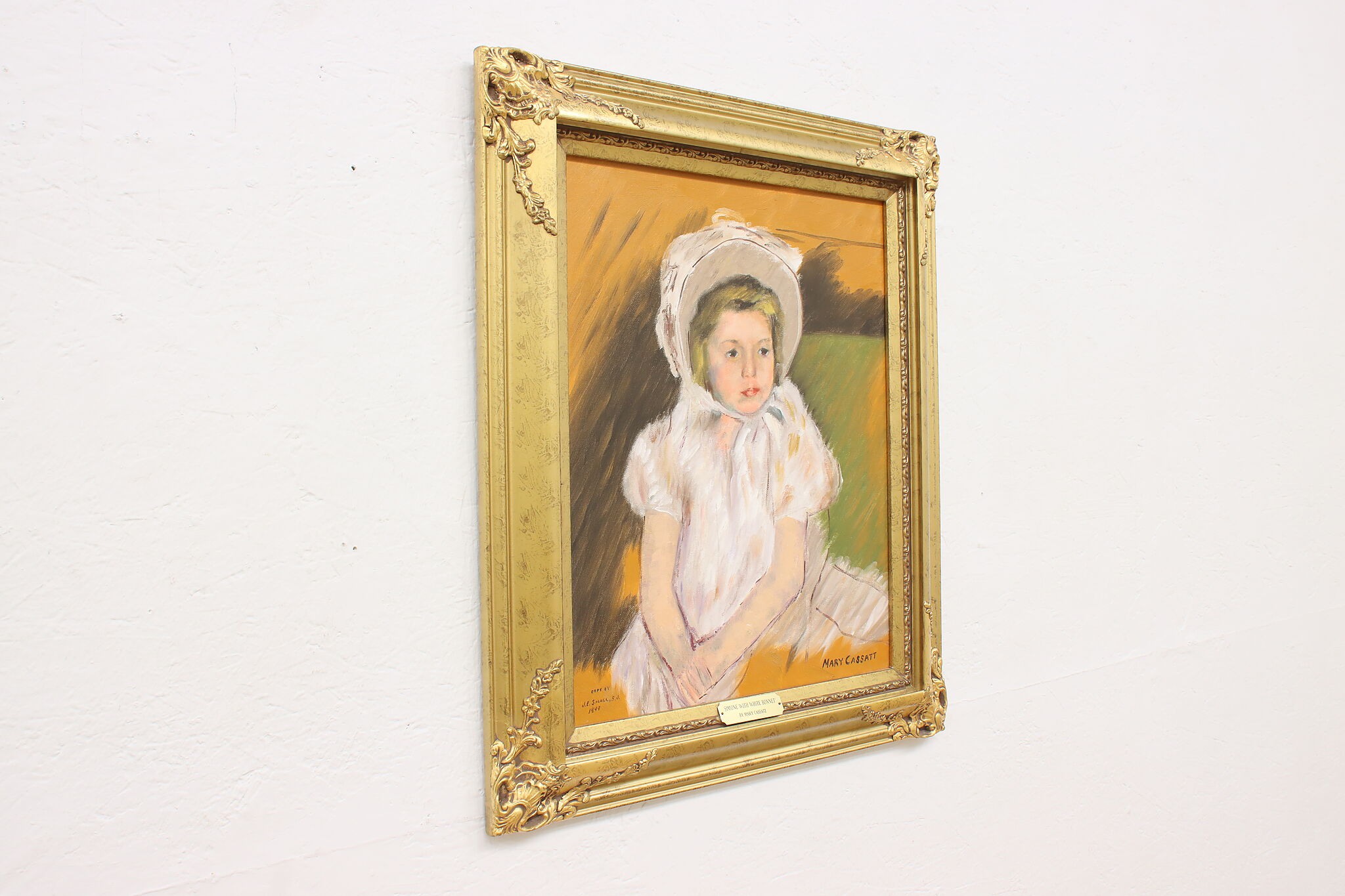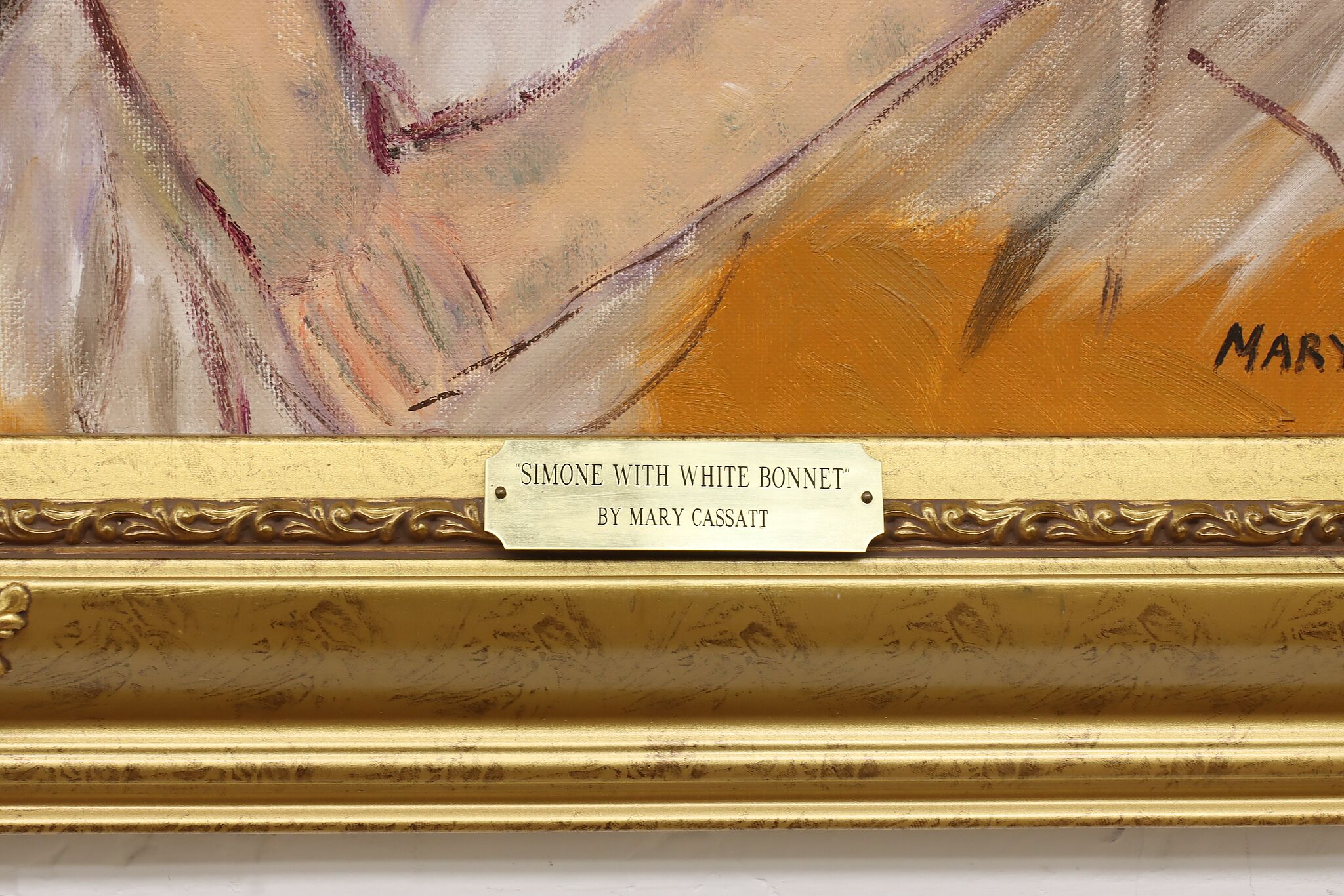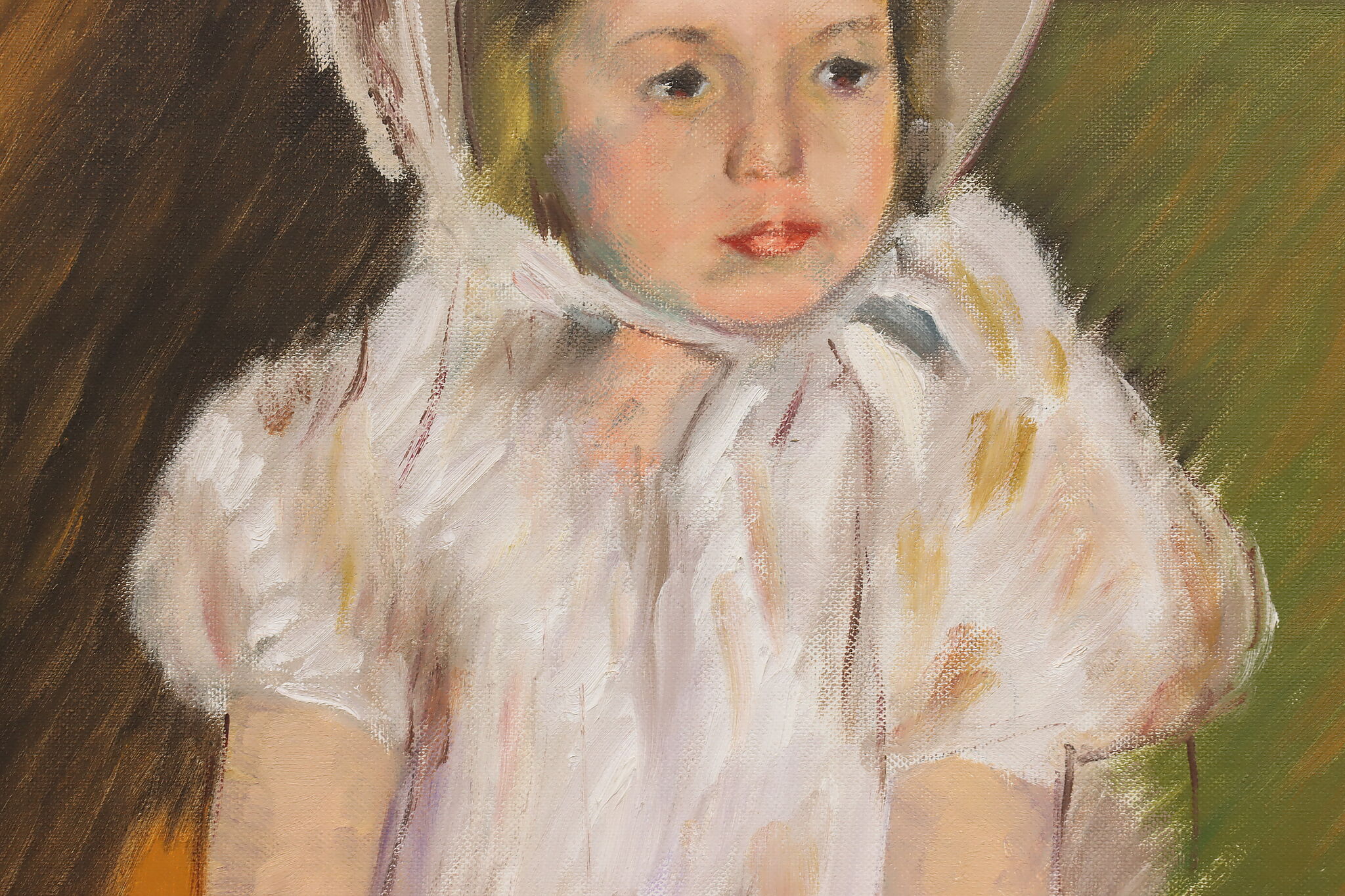 Mary Cassatt's "Simone in White Bonnet Seated with Clasped Hands" was originally painted in 1903 and has since then been reproduced by various artists.