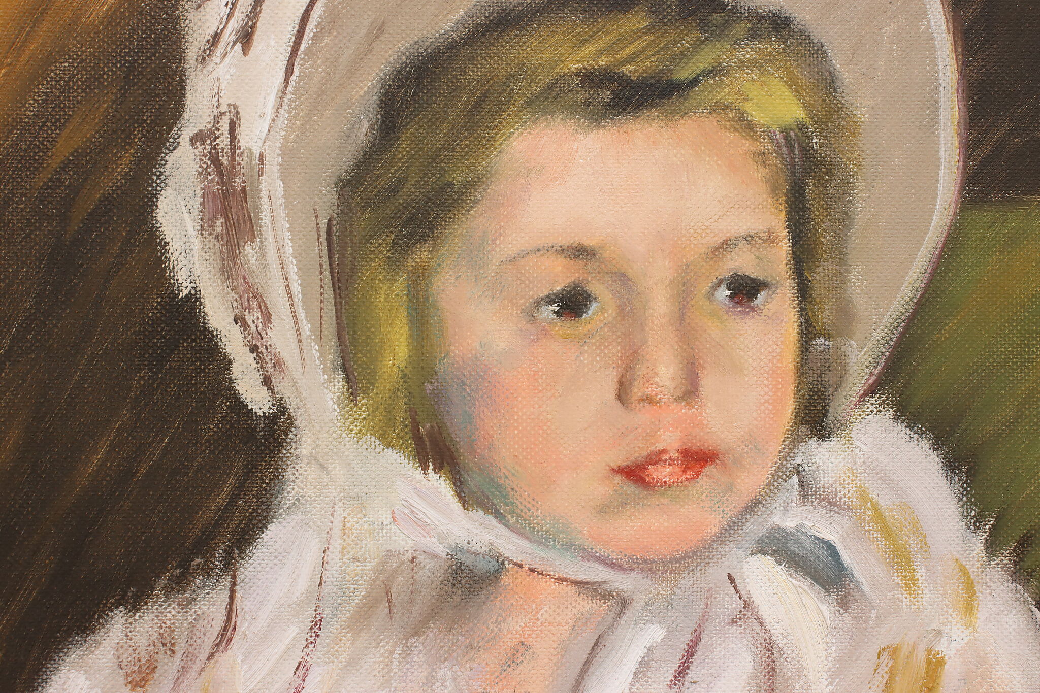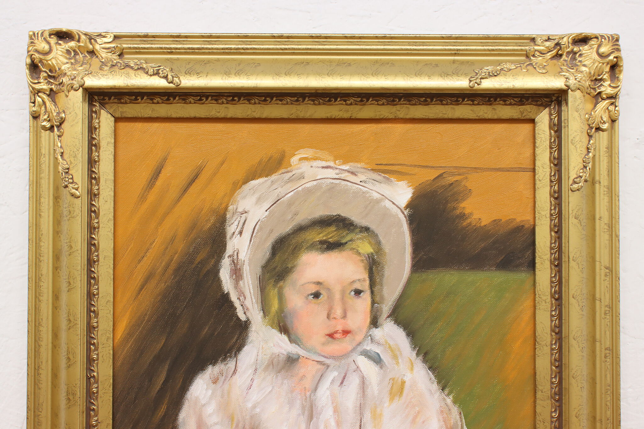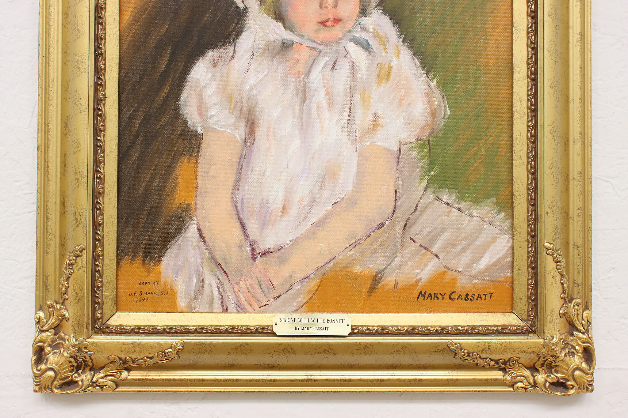 Mary Cassatt's "Simone in White Bonnet Seated with Clasped Hands" was originally painted in 1903 and has since then been reproduced by various artists.